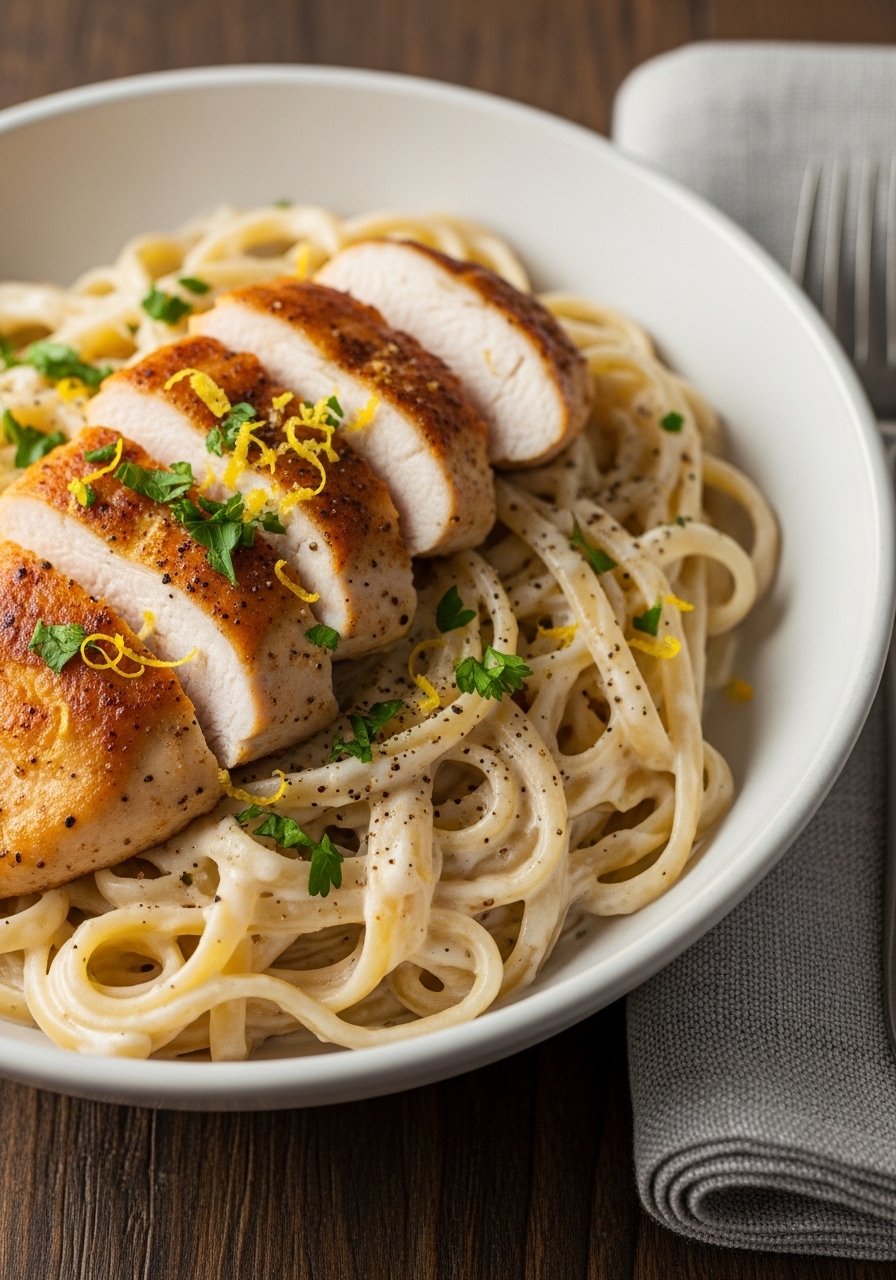 - Toss fettuccine in sauce until coated. Add sliced chicken on top and sprinkle 2 tbsp parsley and lemon zest.