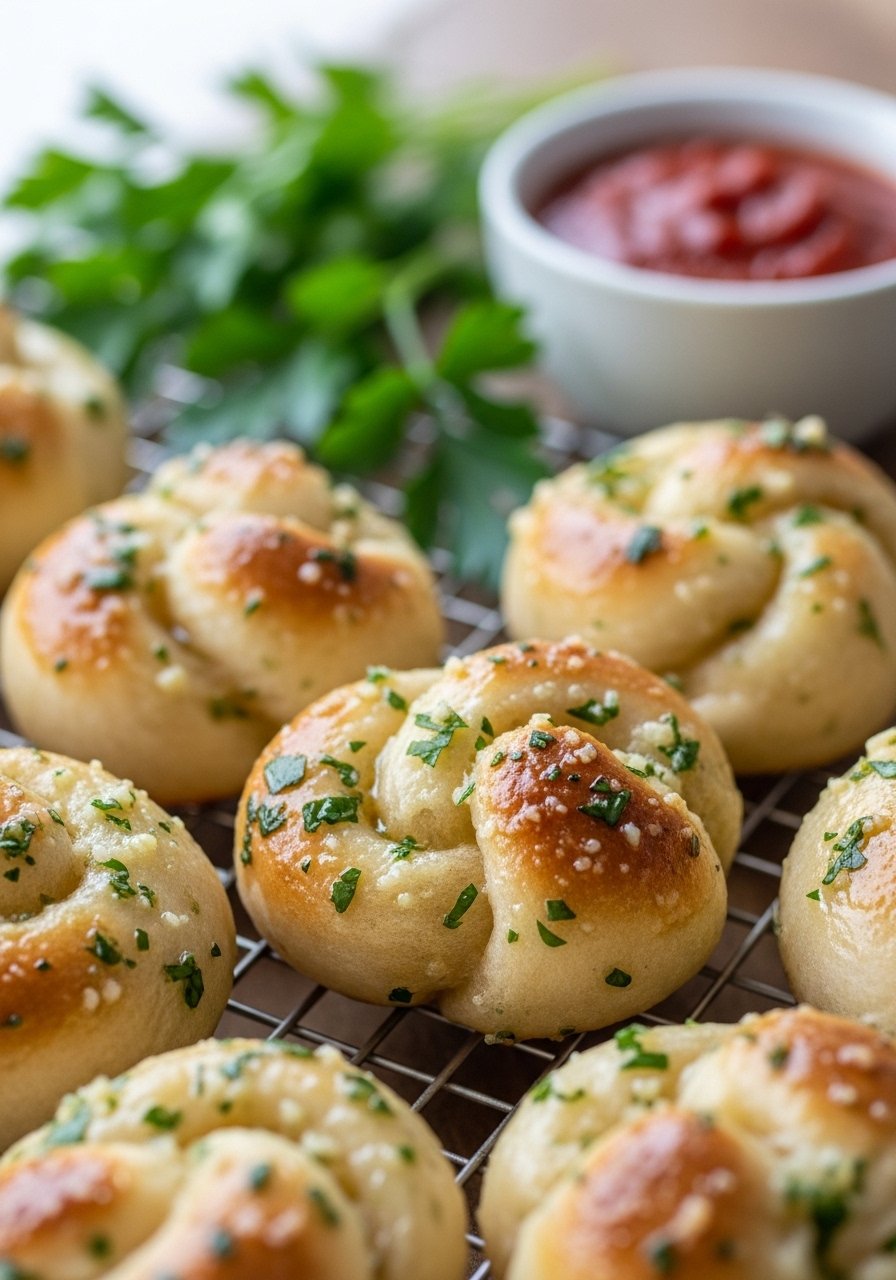 Serve with marinara or garlic aioli and garnish with extra Parmesan and parsley. These knots freeze well—flash-freeze on a sheet then store in freezer bags. Reheat from frozen in a 375°F oven for 10–12 minutes.
