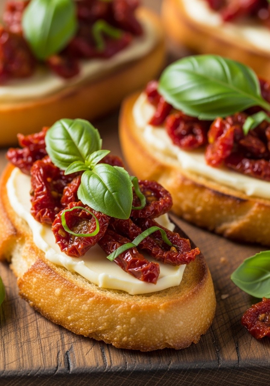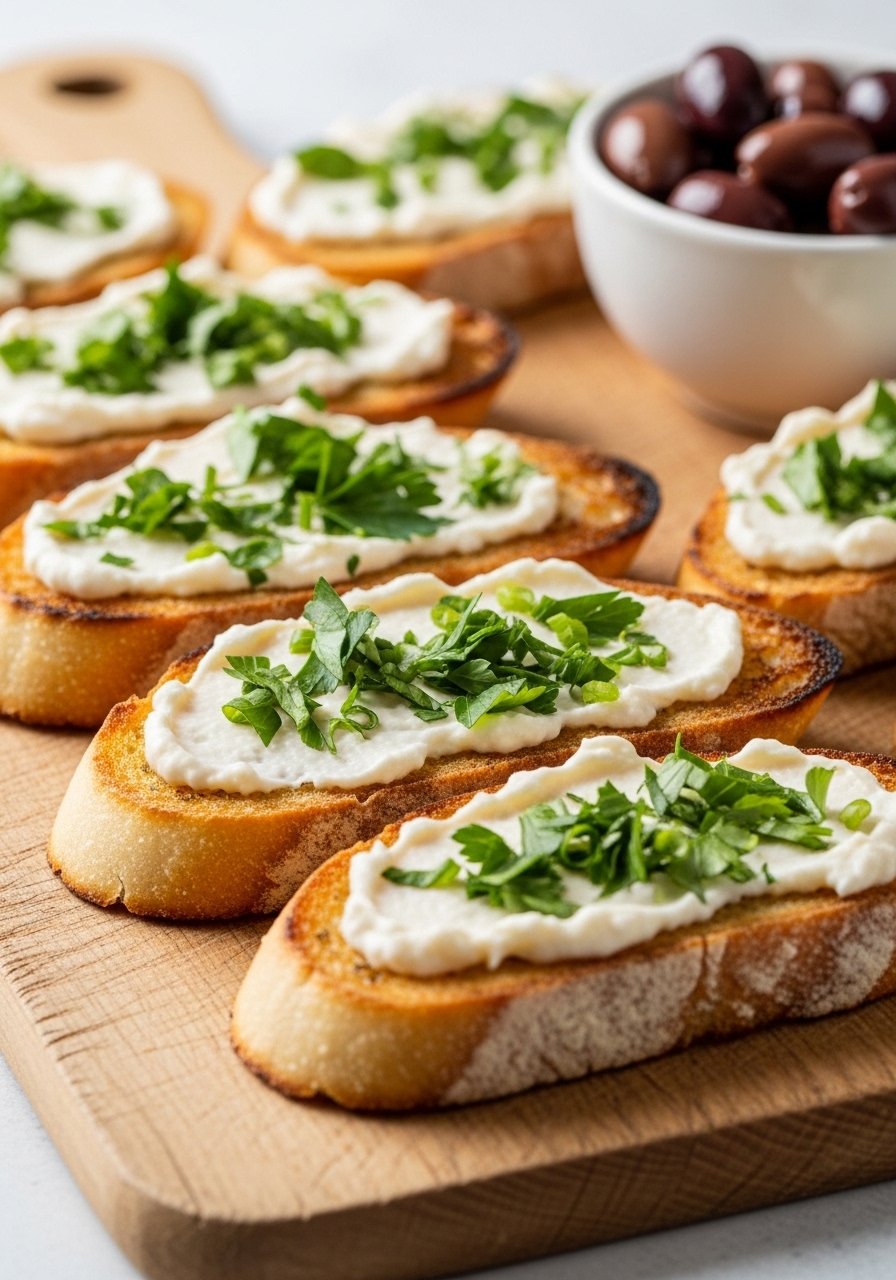 Top crostini with tomato bruschetta or roasted peppers for variety. Store in airtight containers for up to 2 days; reheat at 350°F for 4–6 minutes to re-crisp.