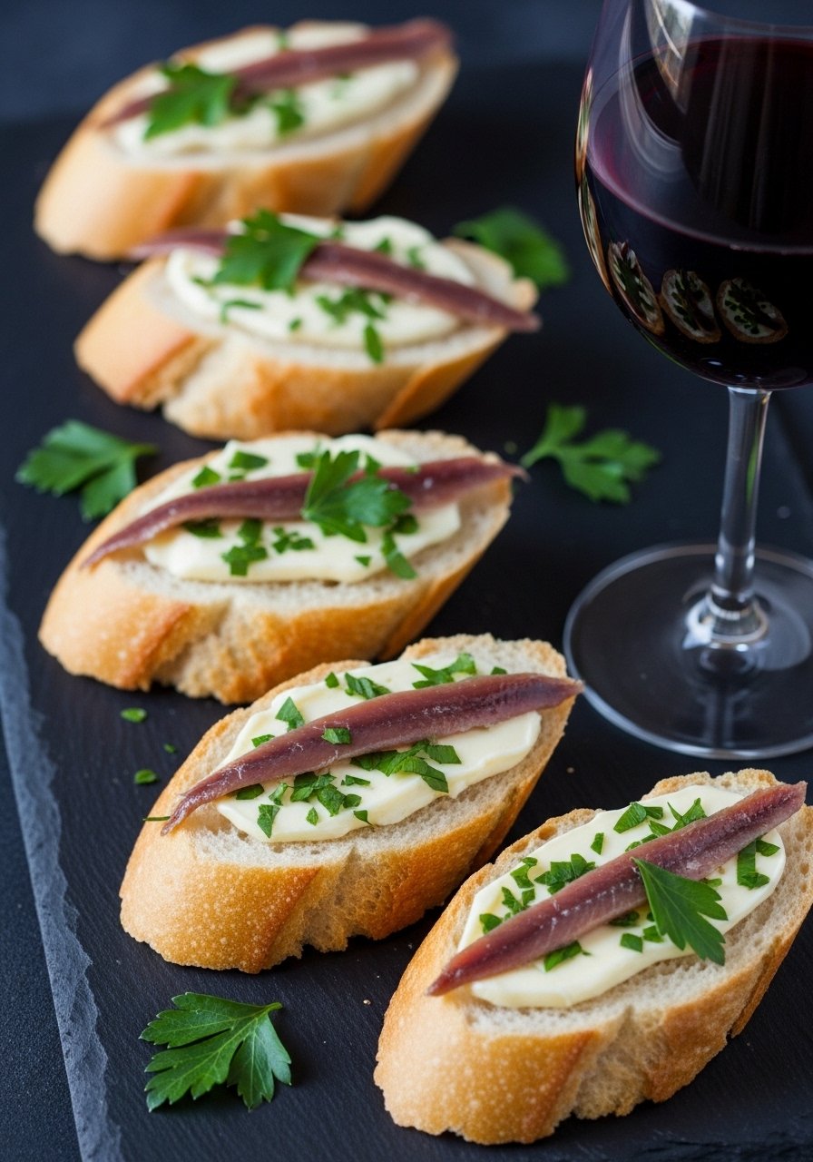 - Spread garlic butter on baguette slices (mix 2 cloves garlic into butter). Toast under broiler 1–3 minutes until golden.