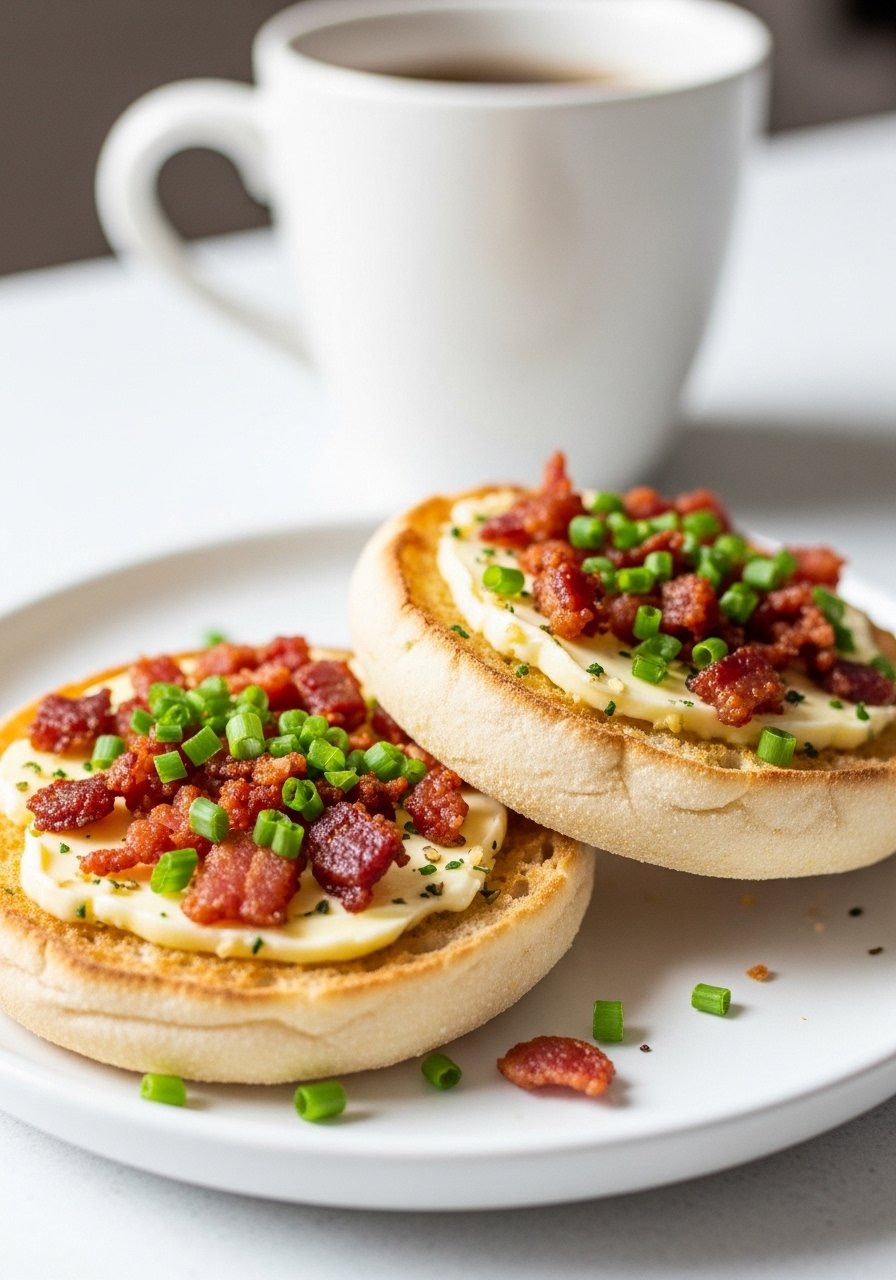 Add crisp bacon for smoky depth without fancy ingredients. English muffins are cheap and toasty—great for breakfast or brunch garlic bread. Use a non-stick skillet to crisp bacon fast.