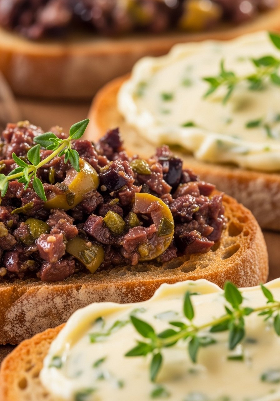 A savory olive tapenade adds briny depth to garlic butter toasts. It’s budget-friendly when you use canned olives and pantry herbs. Chop with a chef’s knife for the best texture.