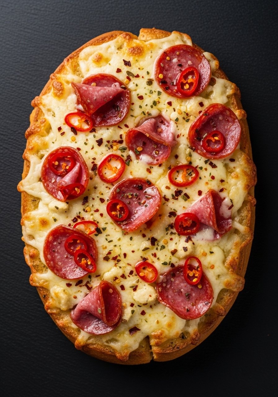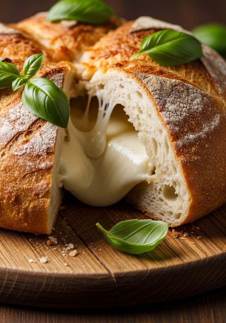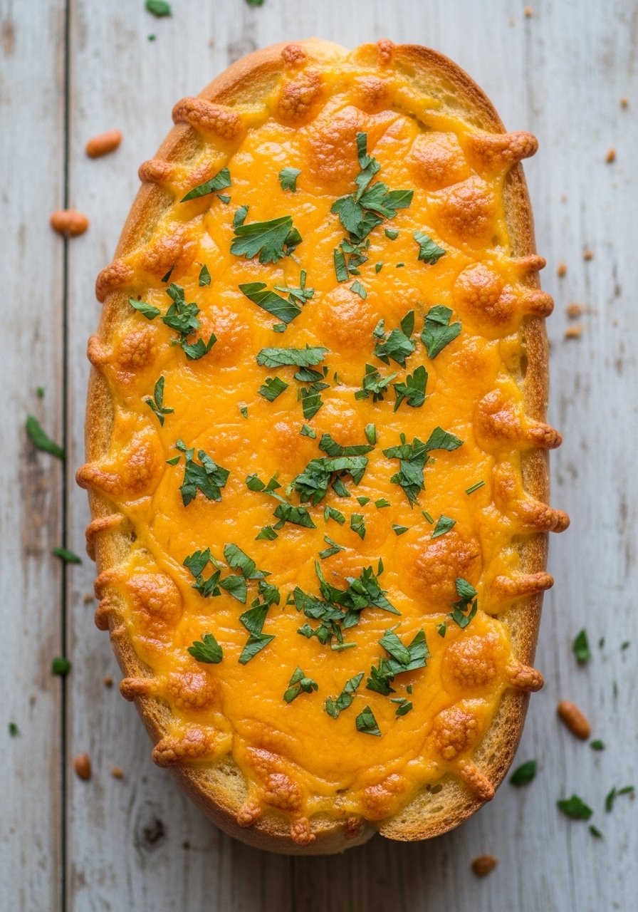 - Wrap loaf in foil and bake 10 minutes; unwrap and bake another 8–10 minutes until cheese is bubbly and edges are golden. Visual cue: cheese should be melted with light brown spots.
