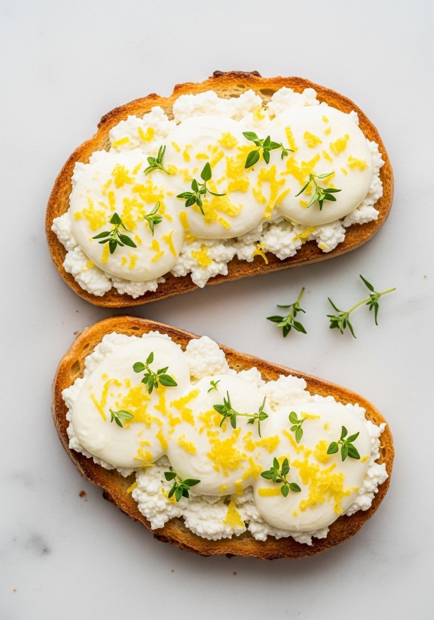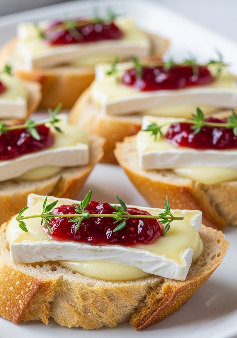 - Add a small dollop of raspberry jam on each toast and finish with thyme. Visual cue: Brie soft and glossy.