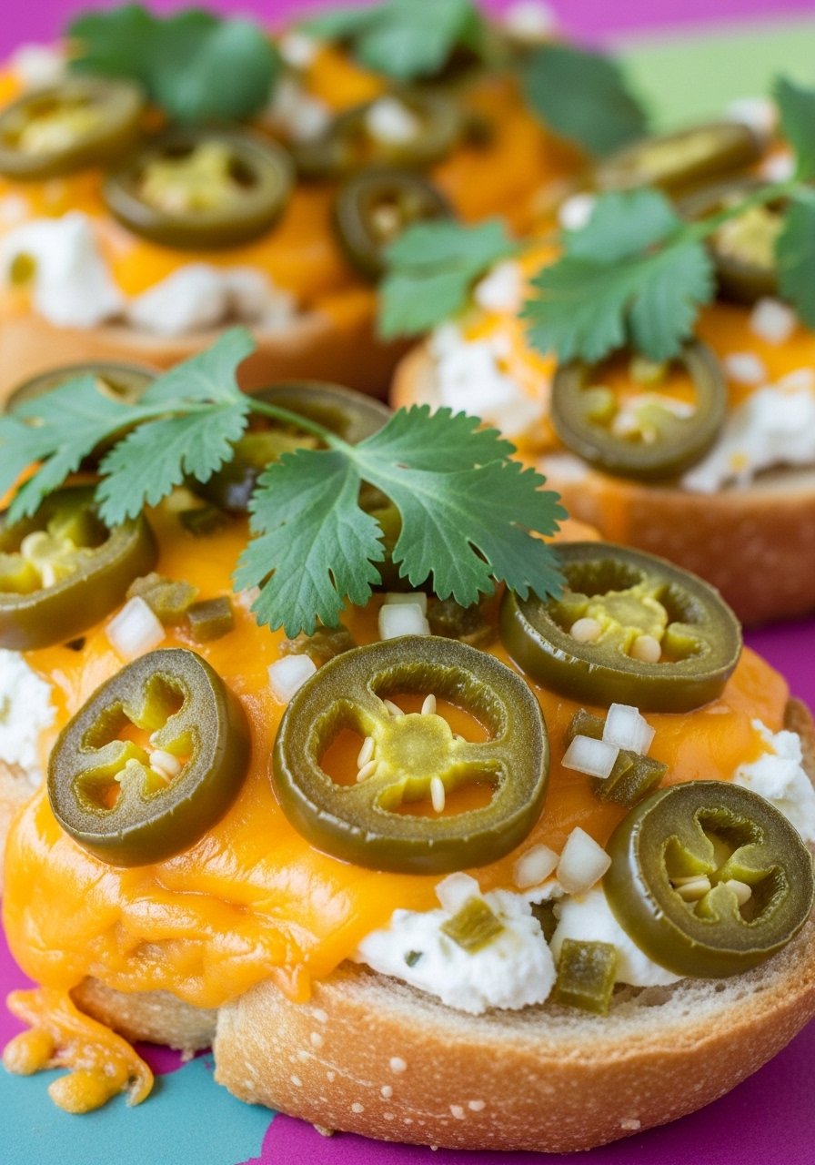 - Mix cream cheese, half the cheddar, jalapeños, and garlic. Spread on bread.