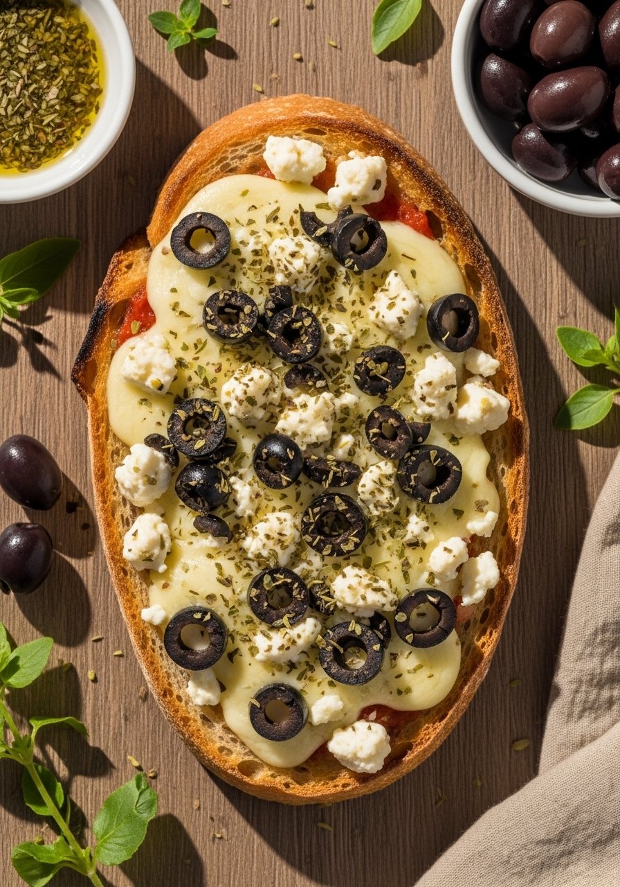 - Top with mozzarella, feta, and olives. Bake 8–10 minutes until cheese bubbles. Visual cue: bubbling cheese and slightly crisped edges.