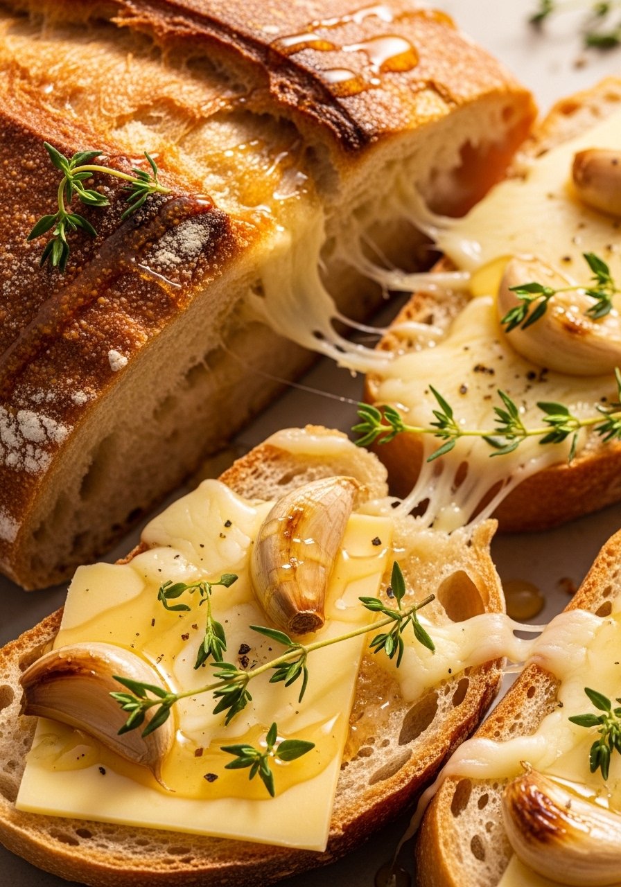 Roasted garlic mellows into sweet, spreadable cloves that pair beautifully with a light honey drizzle and melting cheese. This version feels both cozy and slightly sweet.
