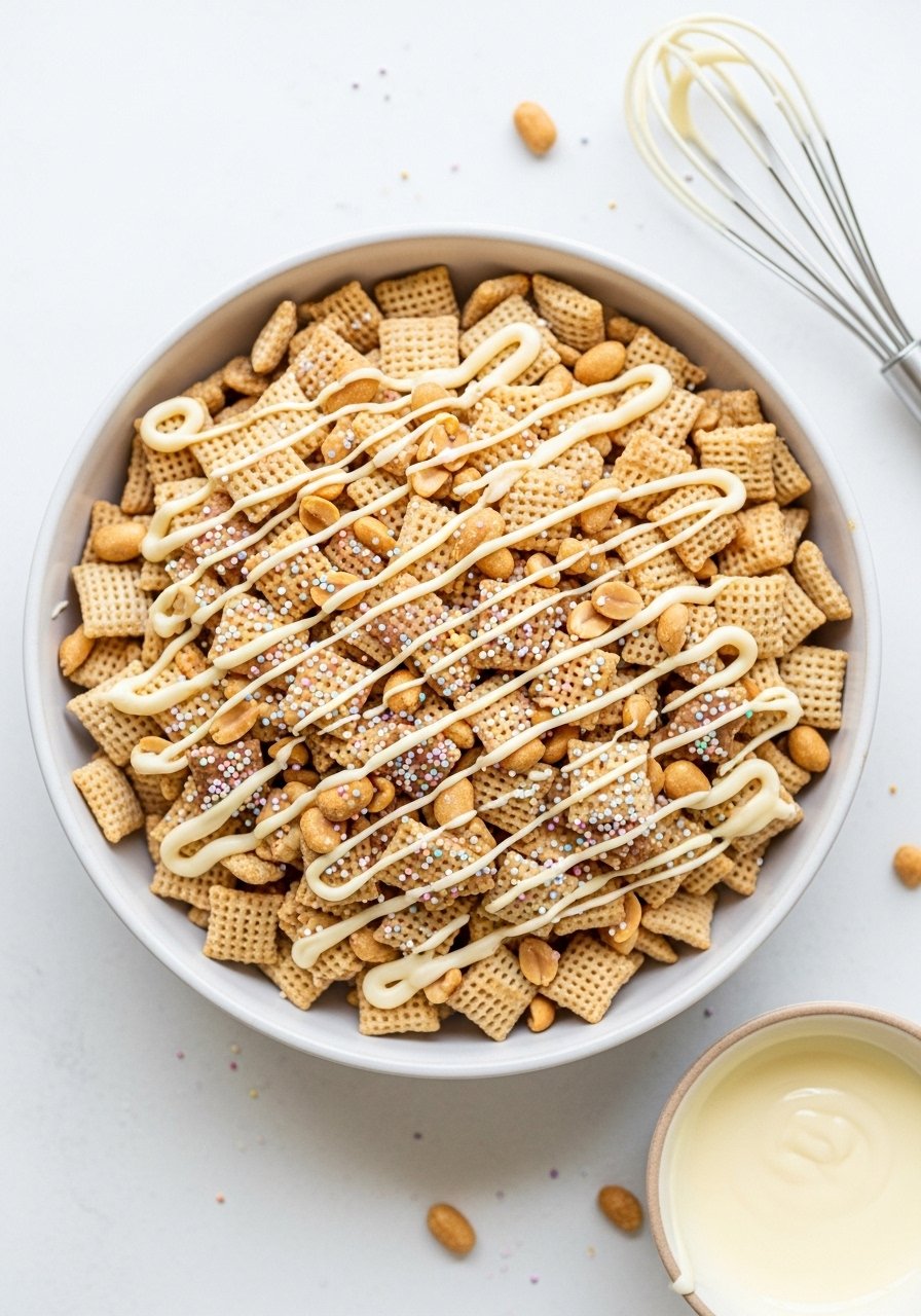 Creamy white chocolate and nutty peanut butter create an indulgent, sweet mix that’s still wonderfully crunchy. This one’s sweet but not overly rich—perfect for bake sales or a dessert snack table. Kids and dessert lovers will be first to the bowl.