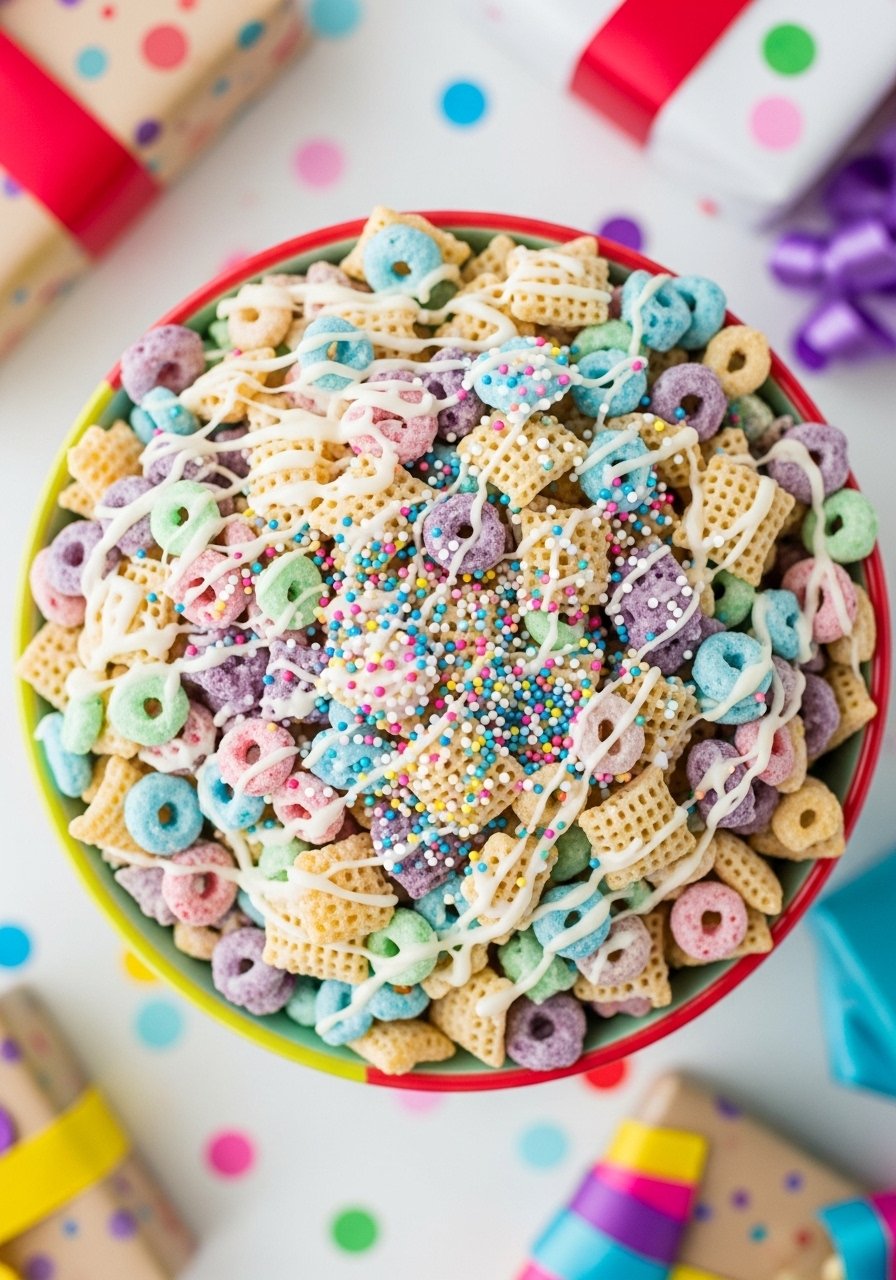 Think sweet vanilla, white chocolate, and sprinkles—this is a festive, kid-approved mix that captures birthday-cake nostalgia in a snack. Great for parties and school celebrations.