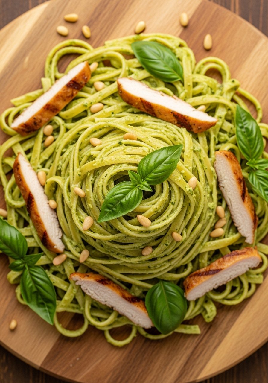 - Toss zoodles with sauce and top with sliced chicken and basil.
