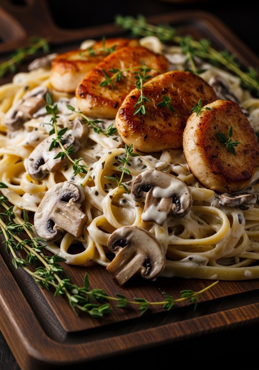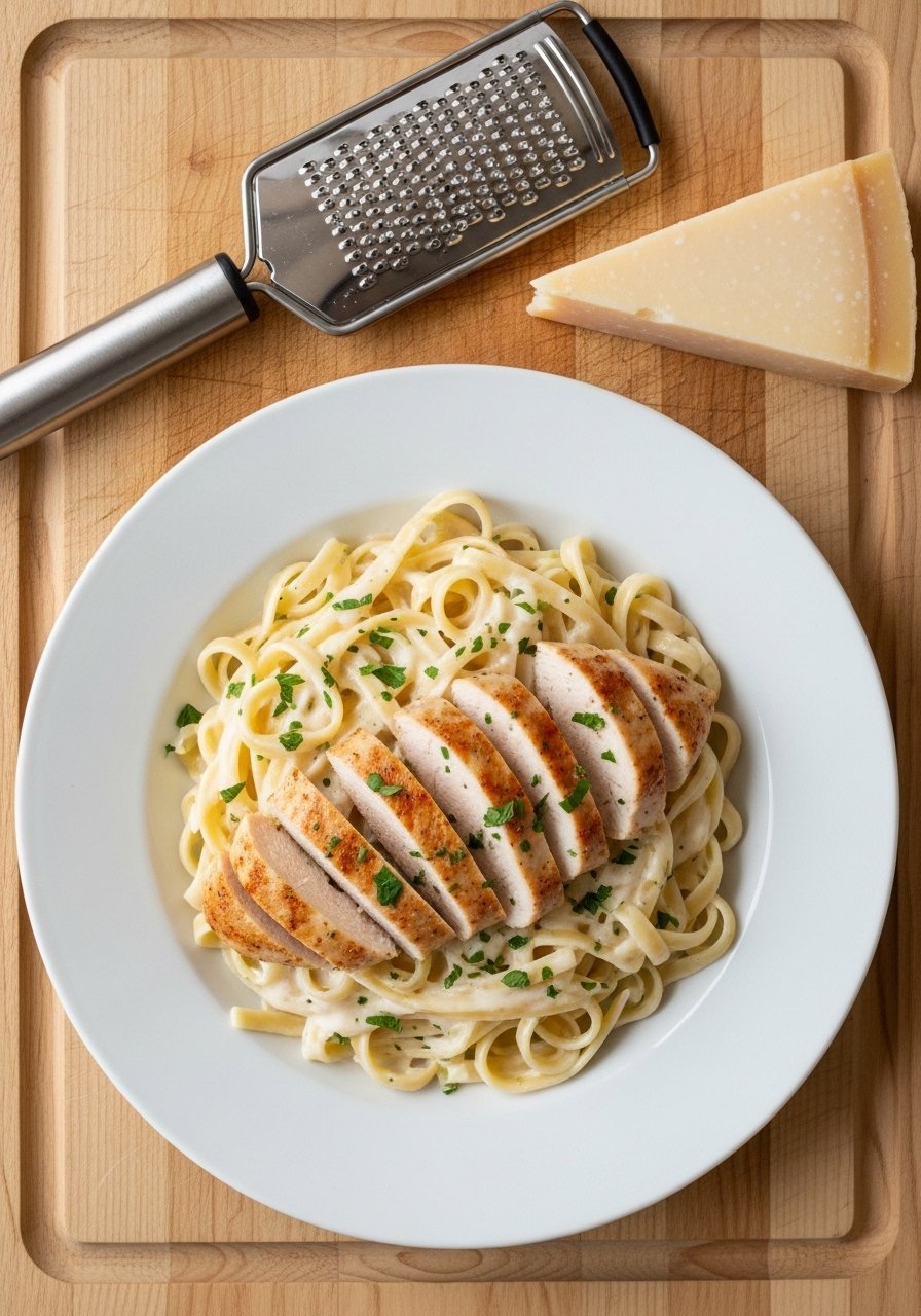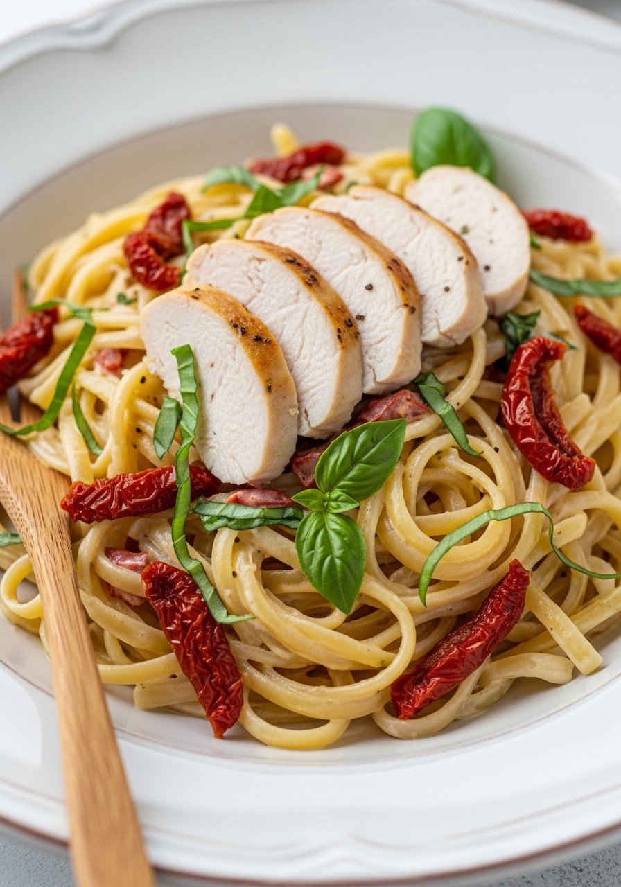 - Toss cooked fettuccine in the sauce, top with sliced chicken, and serve immediately.