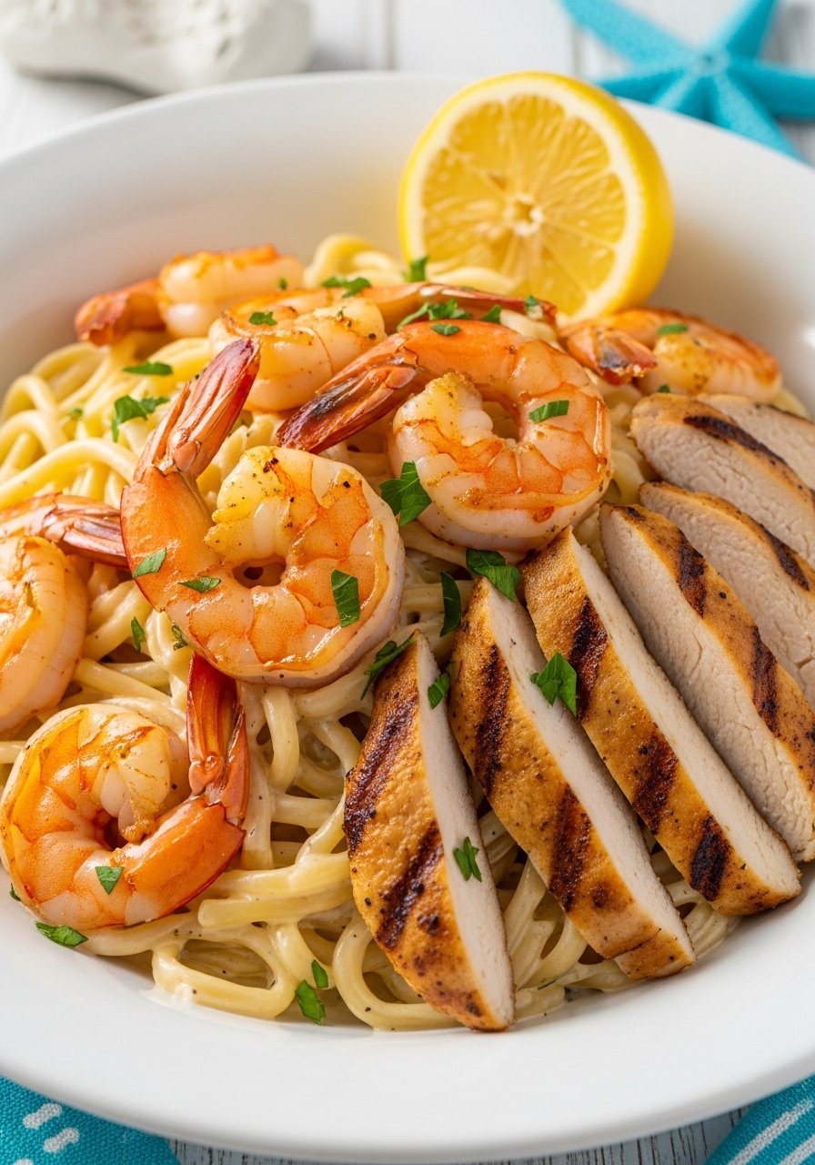 - Toss pasta with sauce, add shrimp and chicken, finish with parsley and lemon.