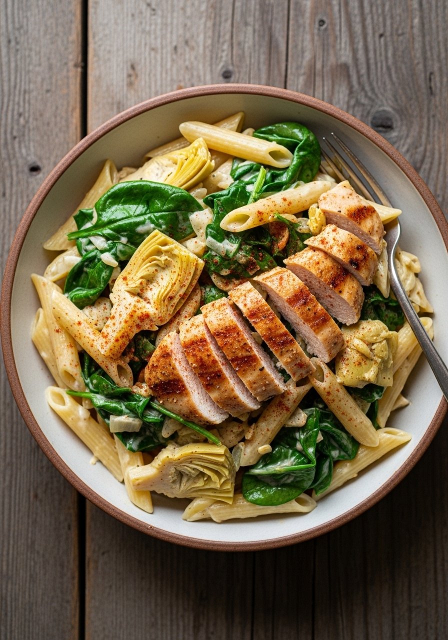 Inspired by the dip, this version folds in artichokes and spinach for an indulgent twist on chicken alfredo with penne. It’s hearty, a bit tangy, and very satisfying.