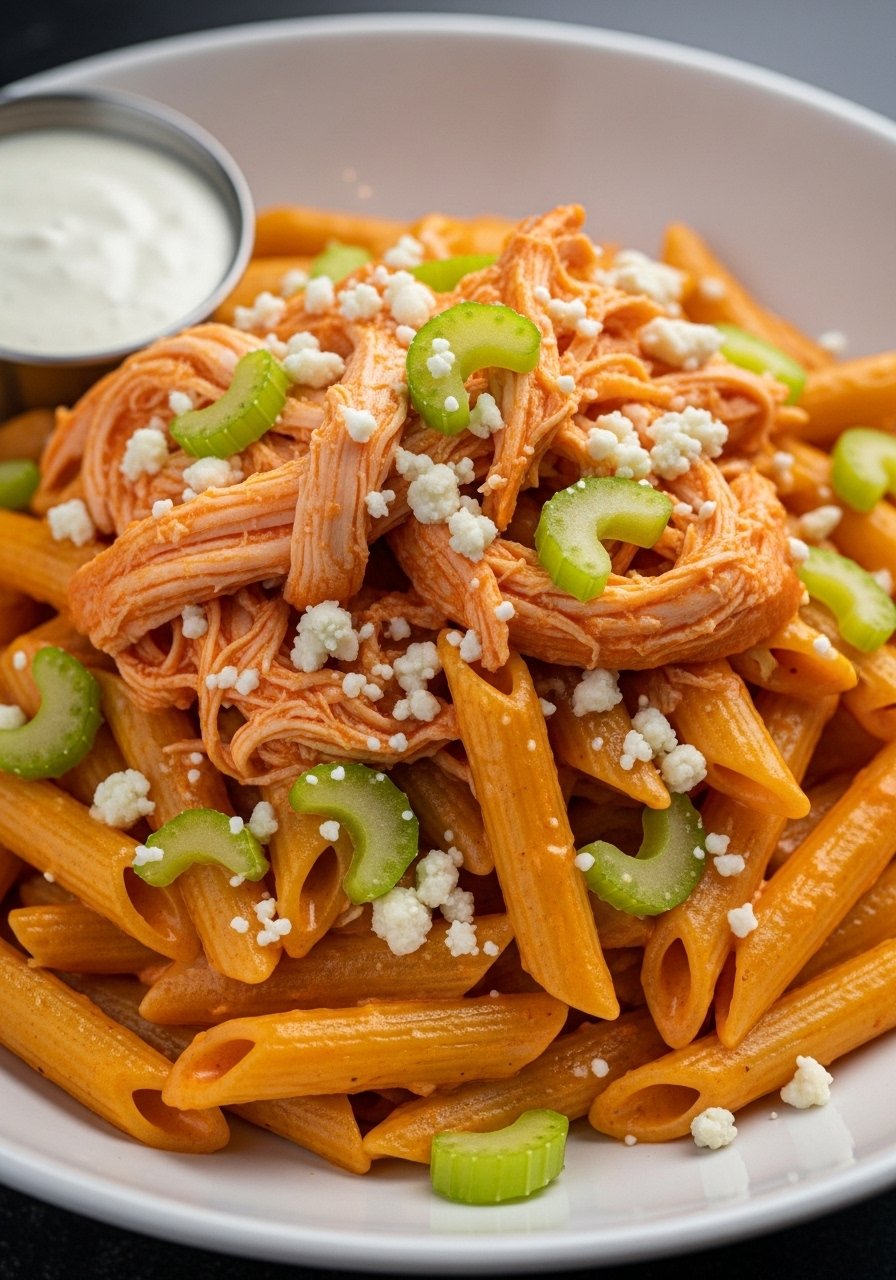 For wings fans who want pasta, Buffalo sauce brightens the creamy base for a spiced, tangy plate. Top with blue cheese or ranch for the classic pairing. It’s bold and crave-worthy.