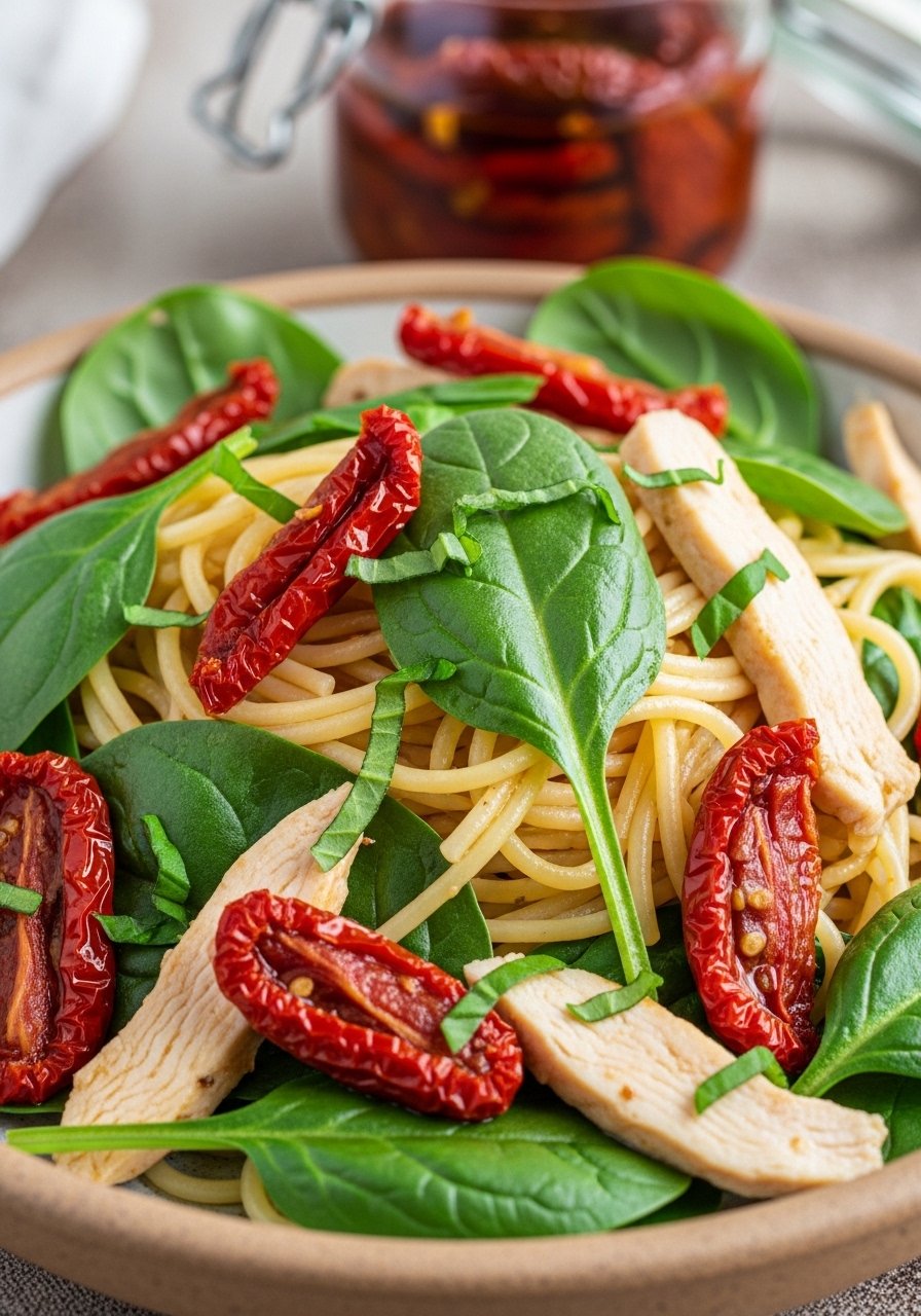 Tangy sun-dried tomatoes add acidity and depth to the creamy sauce, balancing the richness. This chicken alfredo with spinach has a bright red color and Mediterranean notes—great for guests who like layers of flavor.