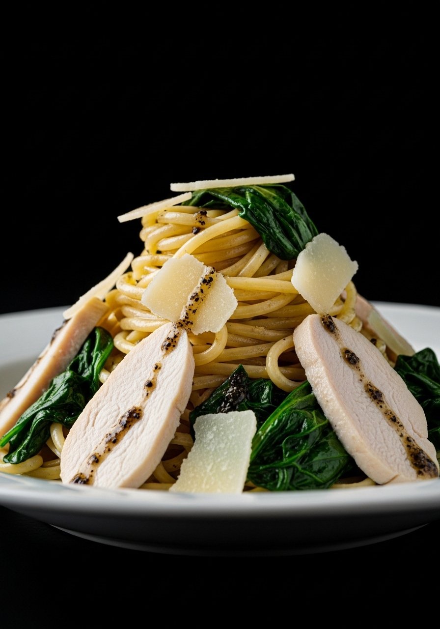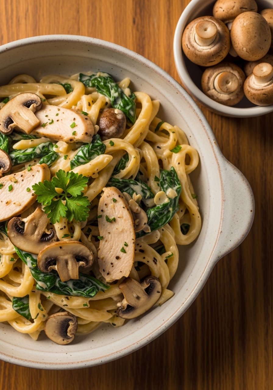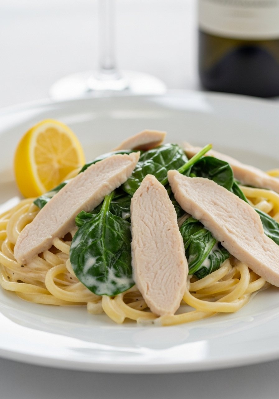 Simple, timeless, and rich—the classic chicken alfredo with spinach highlights silky Alfredo sauce and perfectly seared chicken. The spinach adds a bright, slightly bitter counterpoint and a pop of color. This version is comfort-food-level creamy with a garlicky finish and is perfect for weeknights or date nights.