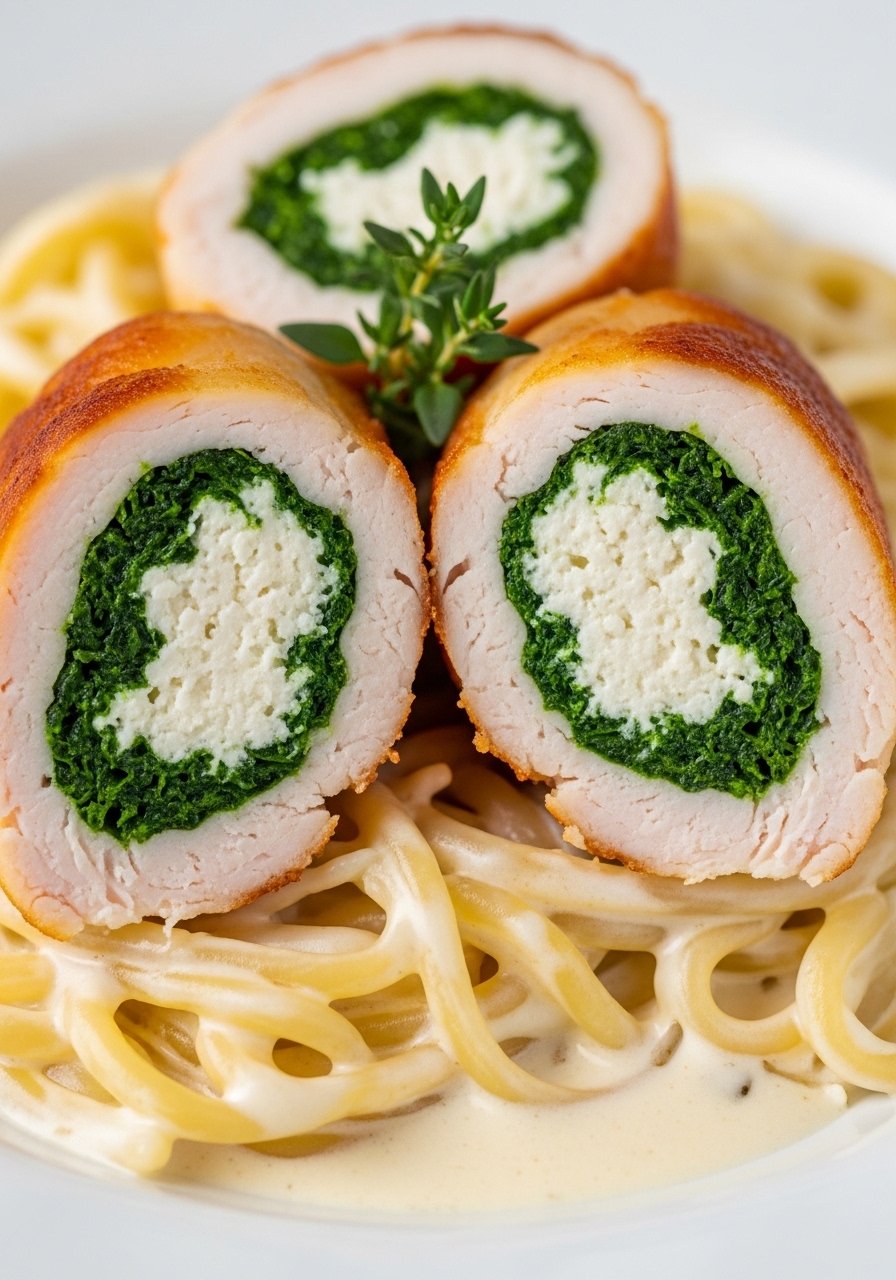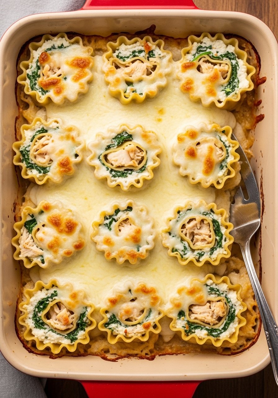 Roll lasagna sheets around a ricotta-spinach-chicken filling, top with Alfredo sauce, and bake for a rich, make-ahead dinner that feels special.