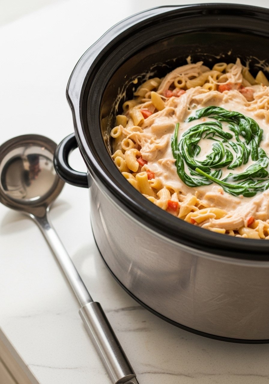 - Stir in chicken, spinach, pasta, salt, and pepper.