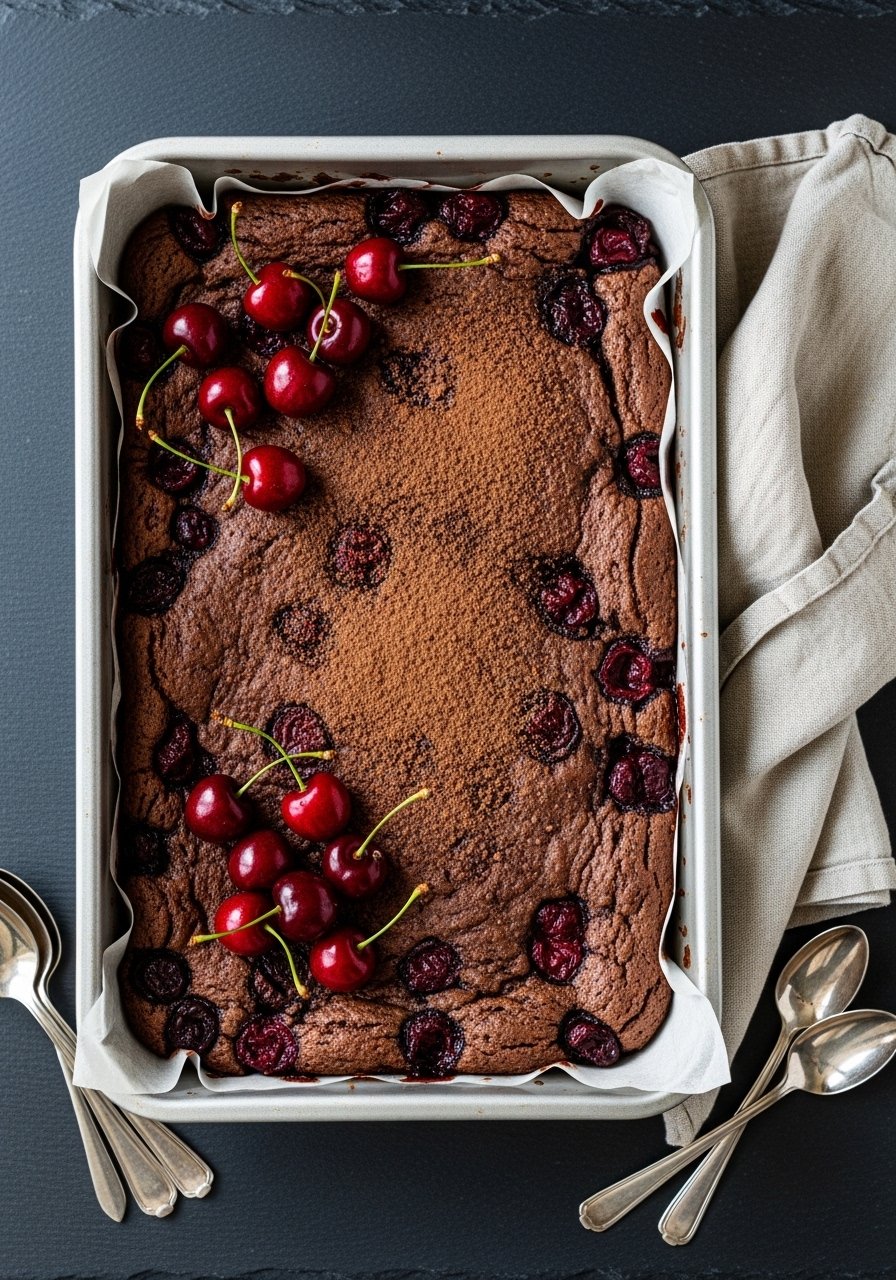 Tart cherries cut through the richness here, giving bright pops against molten chocolate. The filling is jammy and glossy, and the cake topping crisps up into sweet shards. This version is perfect for summer picnics or holiday dessert tables.