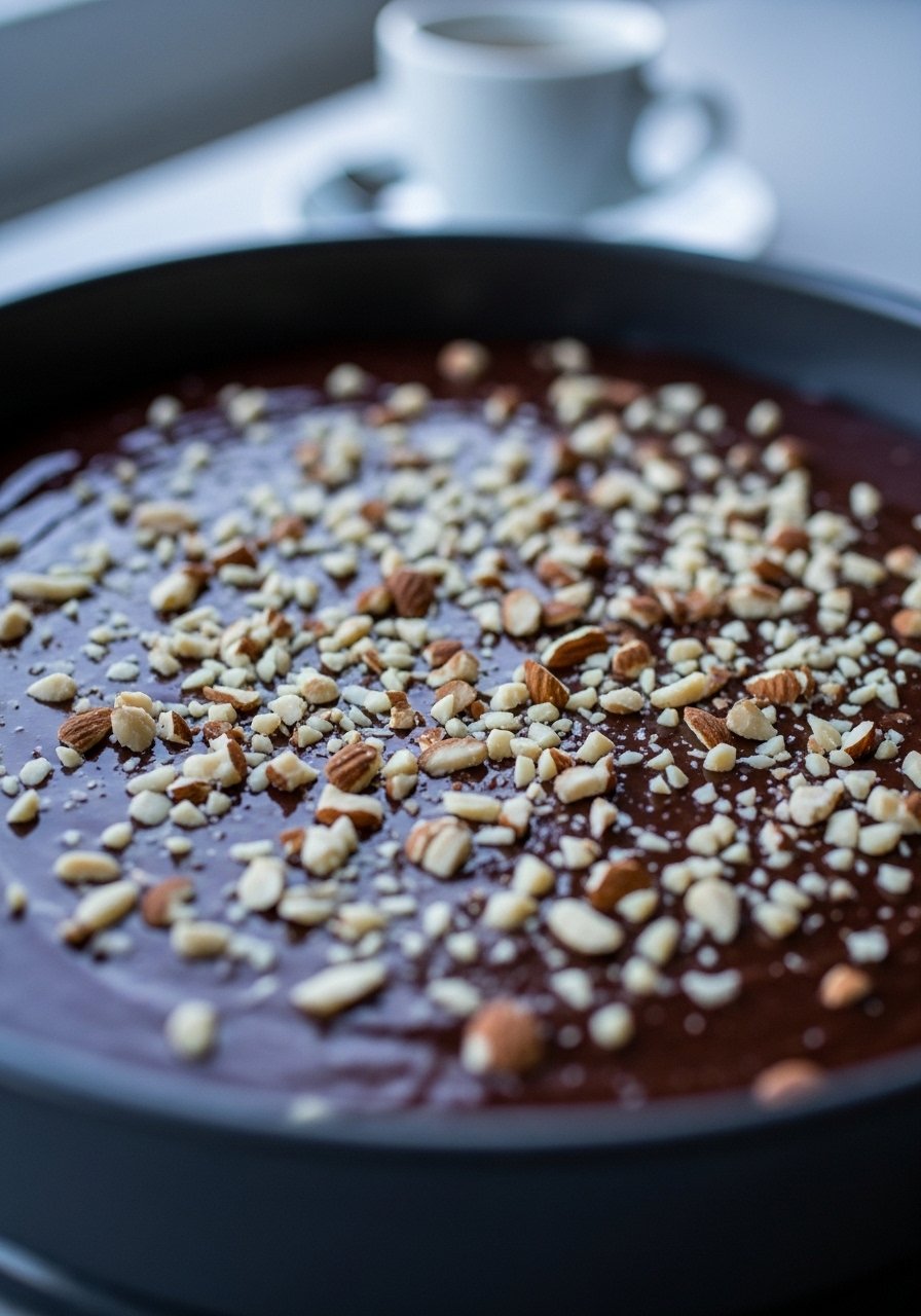 - Scatter chocolate chips, cocoa powder, and sliced almonds across the top.