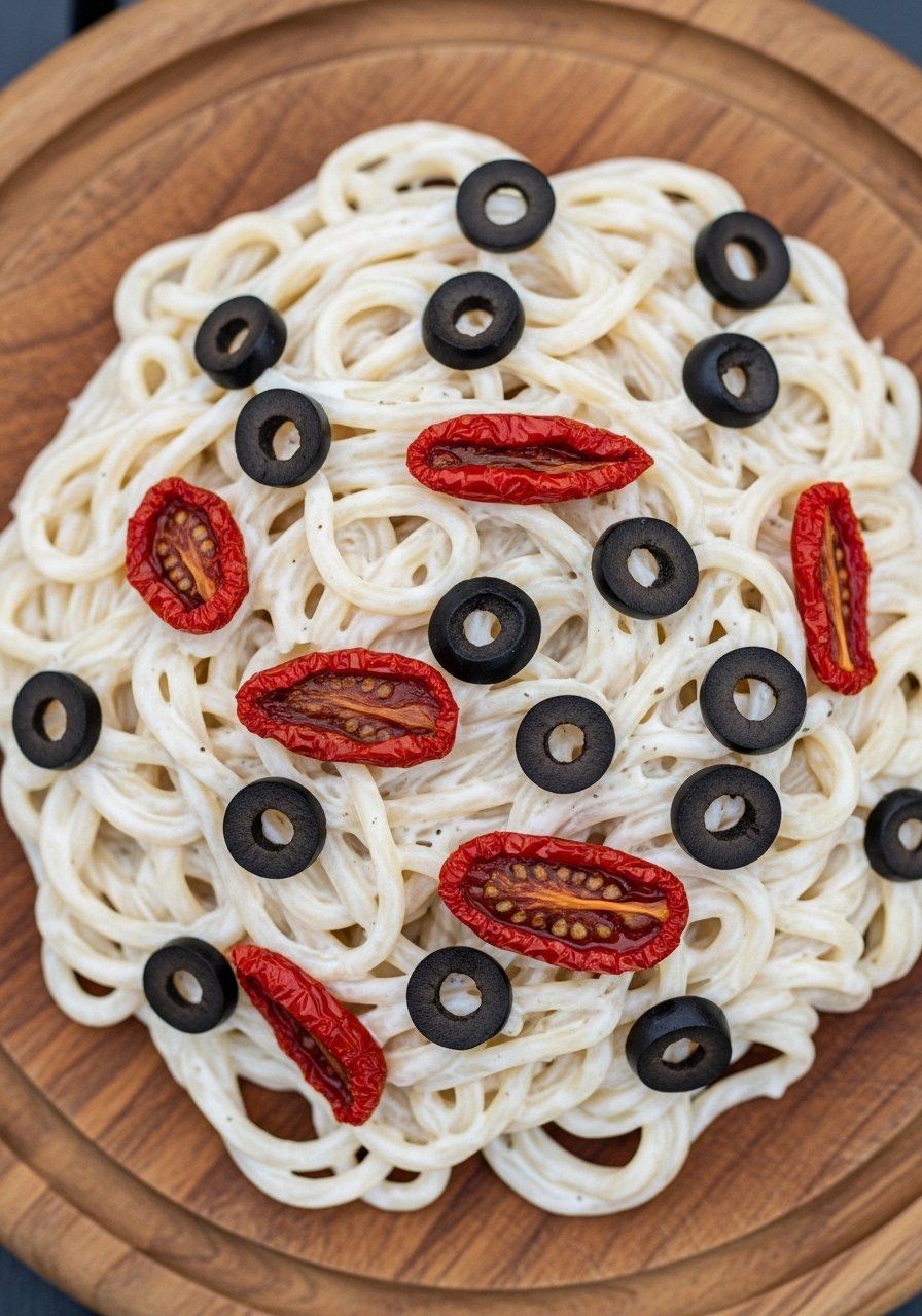 Olives and sun-dried tomatoes give a briny-sweet contrast that’s lively against rich Alfredo. Great with crusty bread.