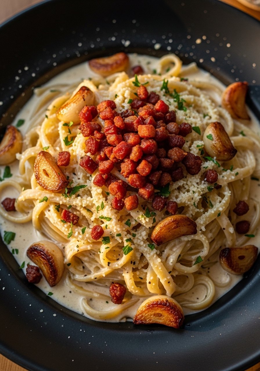 Roasted garlic is sweeter and mellower than raw, pairing with crispy pancetta to give a savory-sweet complexity that deepens the sauce.