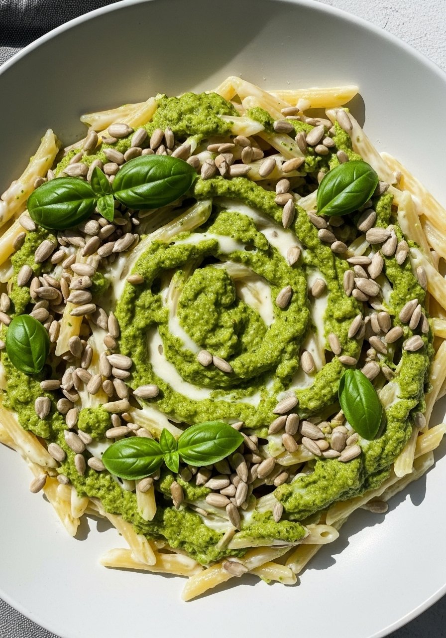 A nut-free pesto using toasted sunflower seeds adds green flavor and texture for those with nut allergies. It’s vibrant and pairs well with the classic Alfredo base.