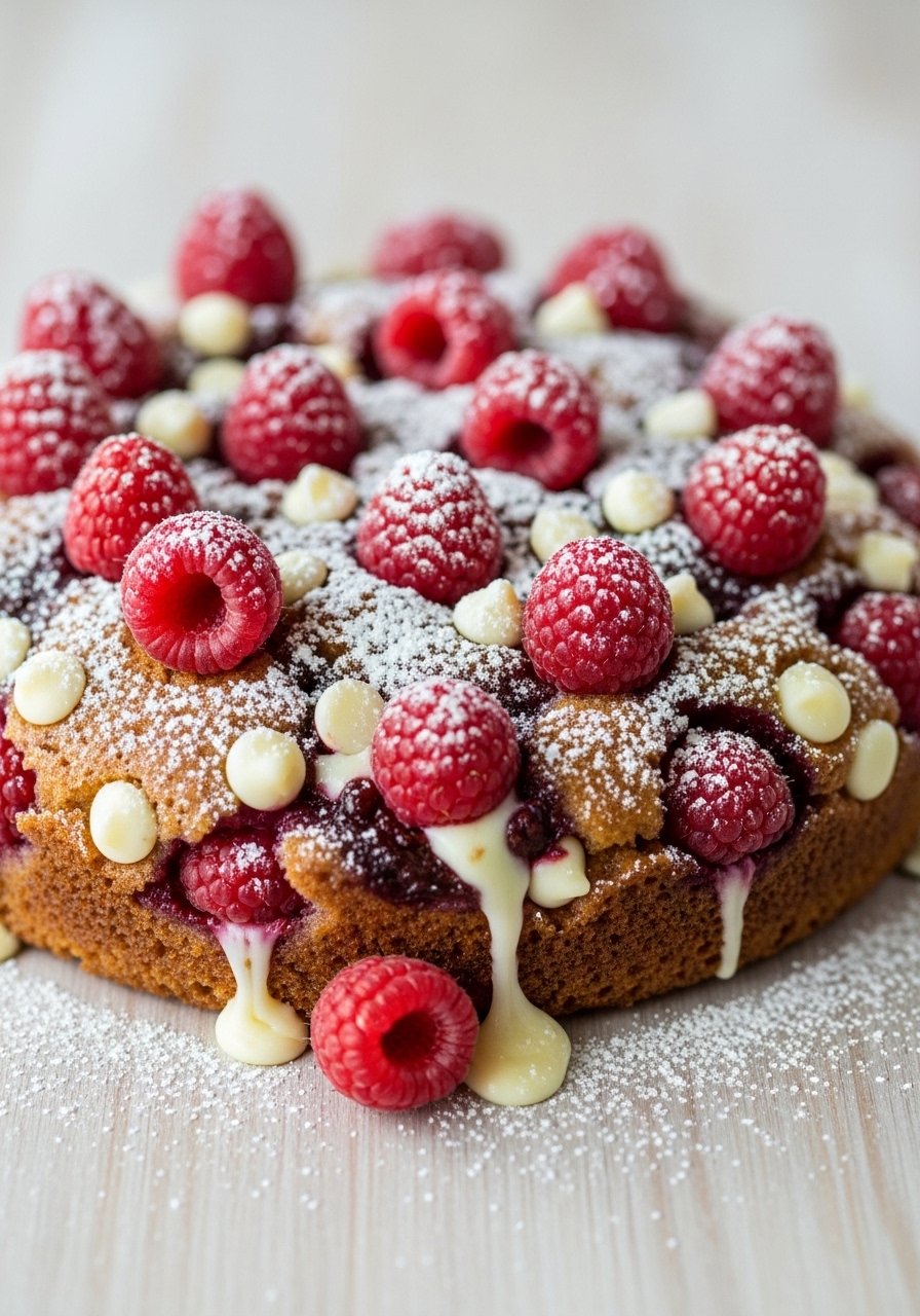 Tart raspberries paired with sweet white chocolate chips make a delicate, elegant dessert. The white cake mix bakes into a gentle, pillowy top that complements the berries.