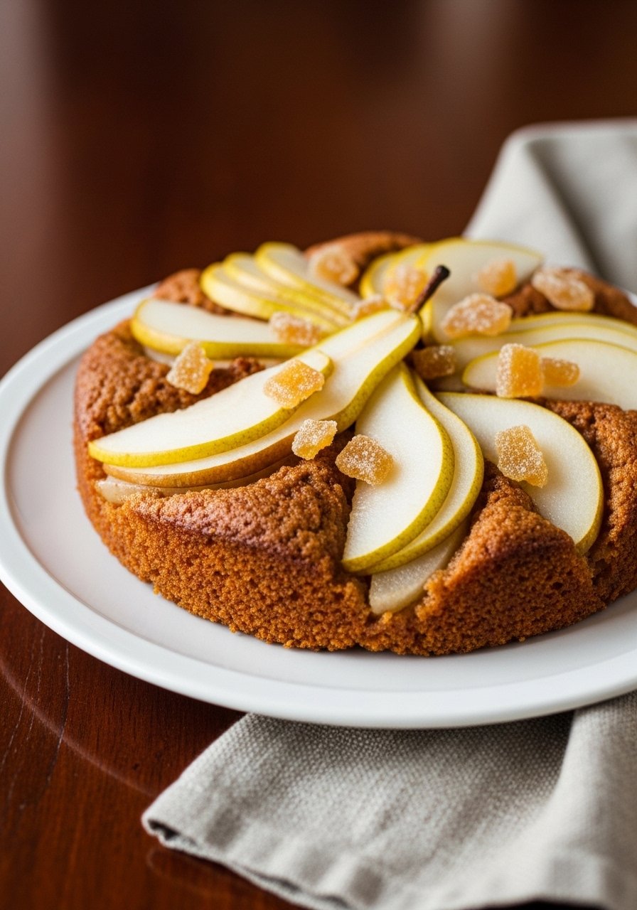 - Sprinkle cake mix over pears and top with crystallized ginger.