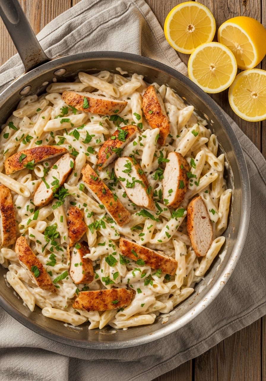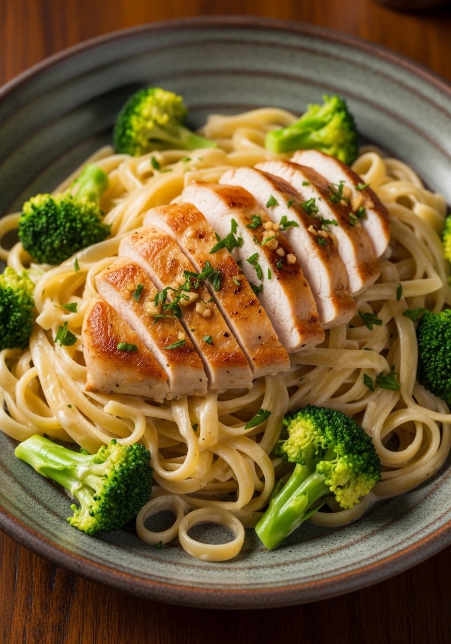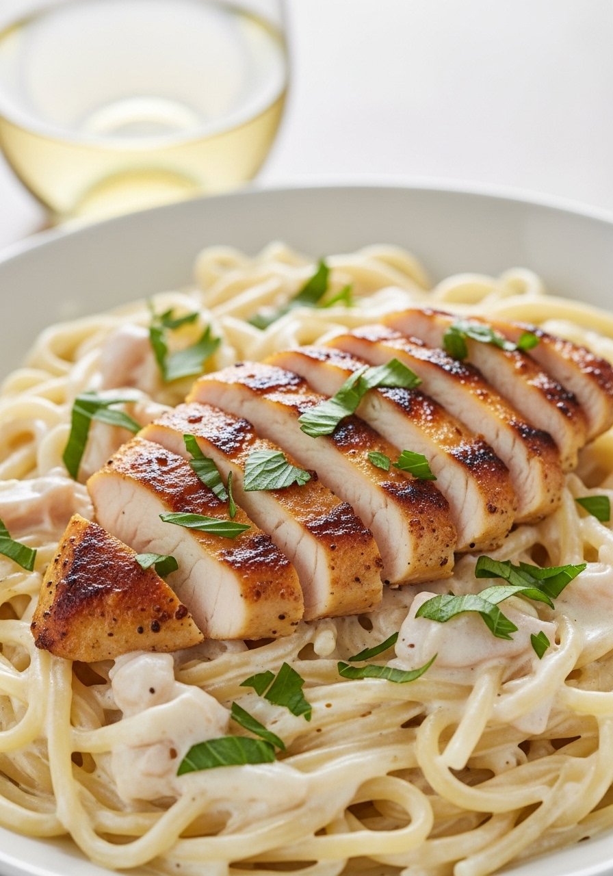 This is the creamy, garlicky classic you grew up loving—made fast. The sauce is silky from butter, cream, and freshly grated Parmesan, while quick-seared chicken adds savory meatiness. It’s rich, smooth, and a weeknight crowd-pleaser.
