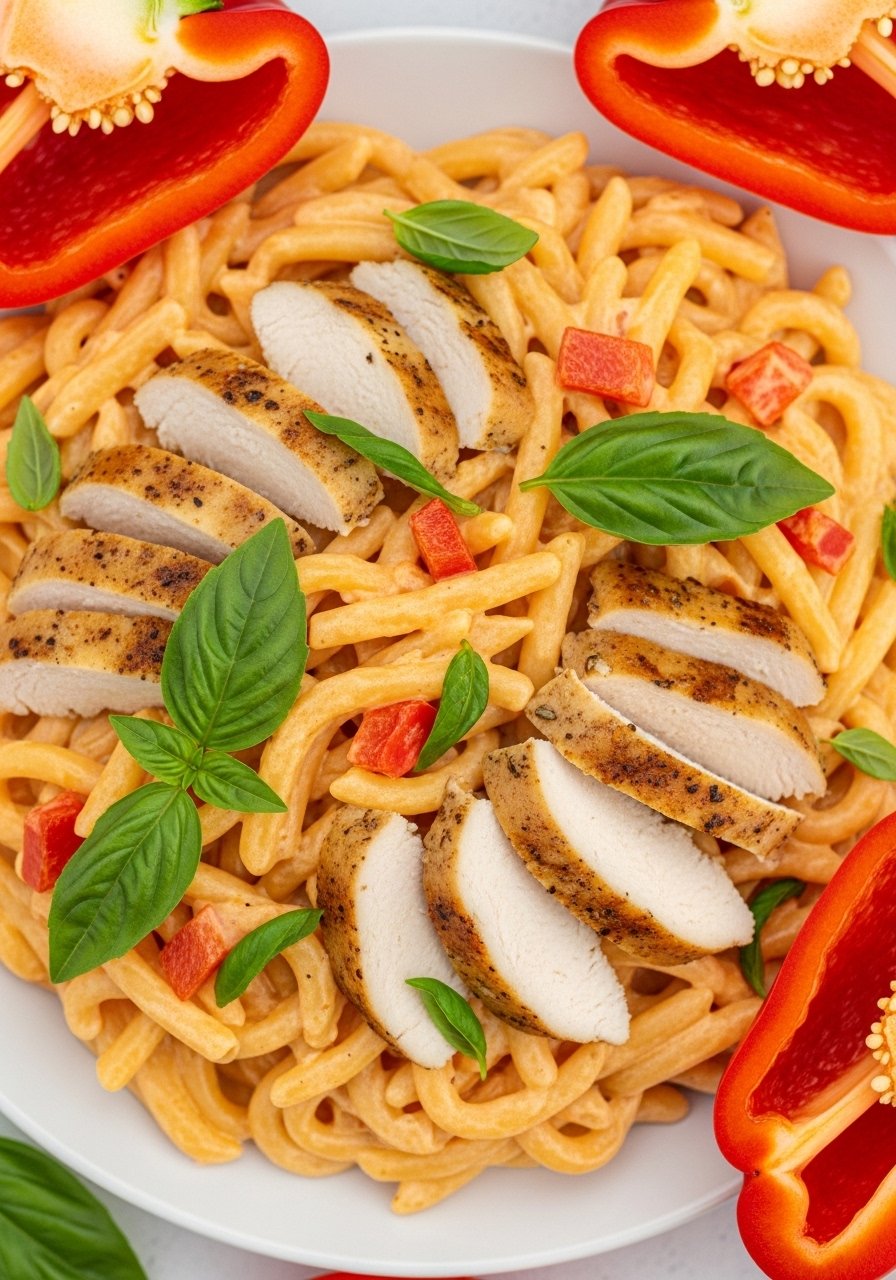- Slice chicken, add to pasta, garnish with basil.