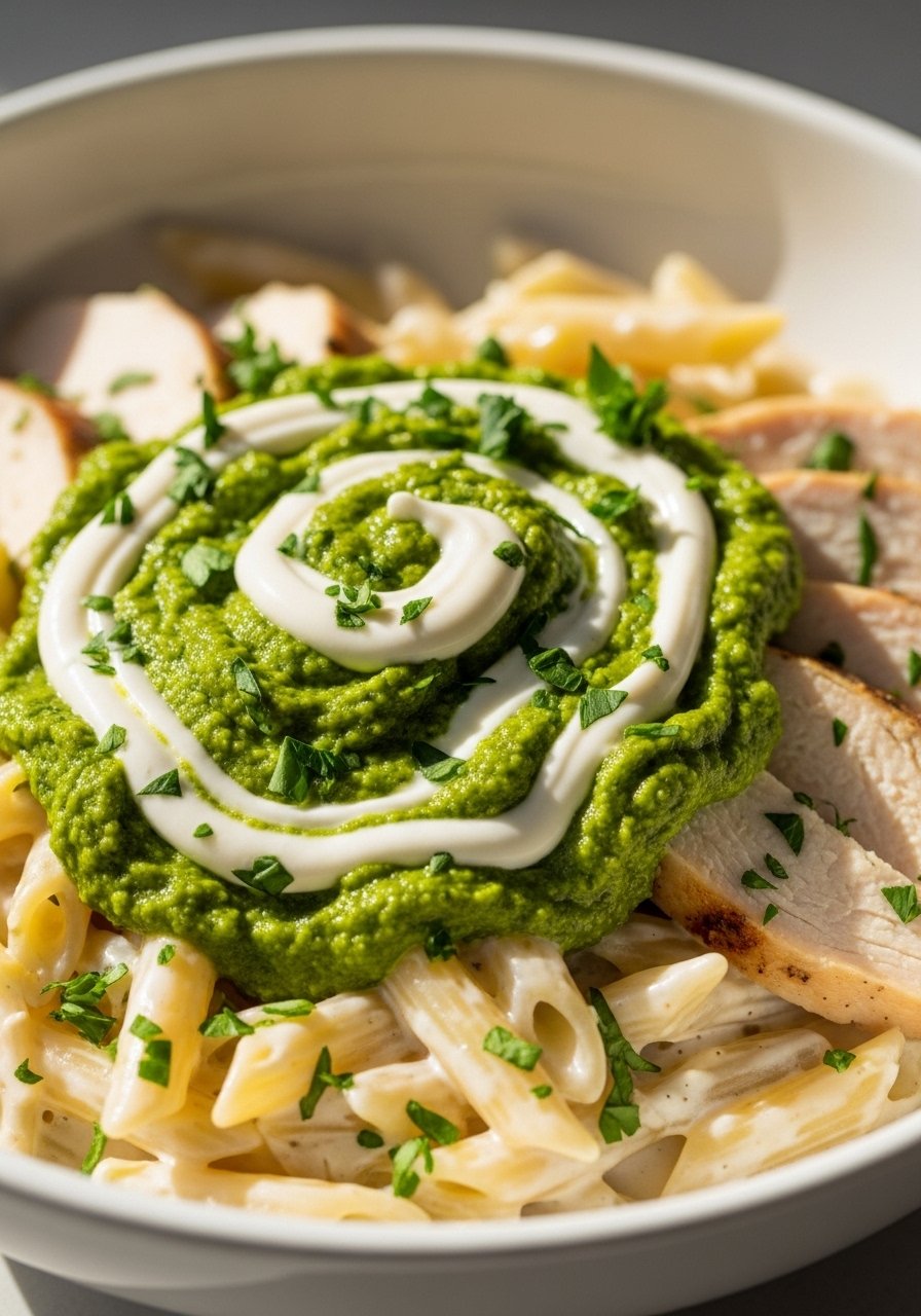 - Combine with pasta and chicken, finish with parsley.