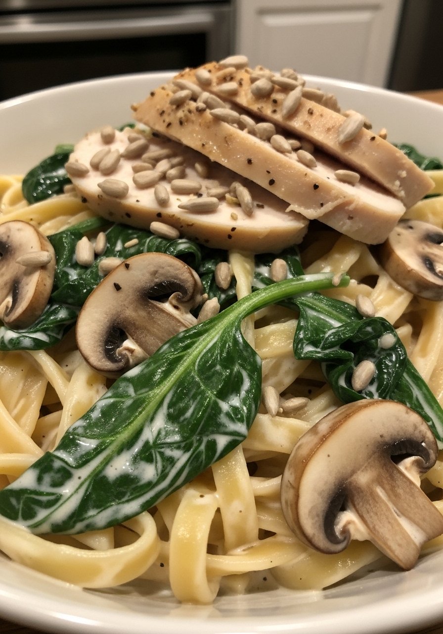22. Mushroom & Spinach Alfredo with Sunflower Seeds
