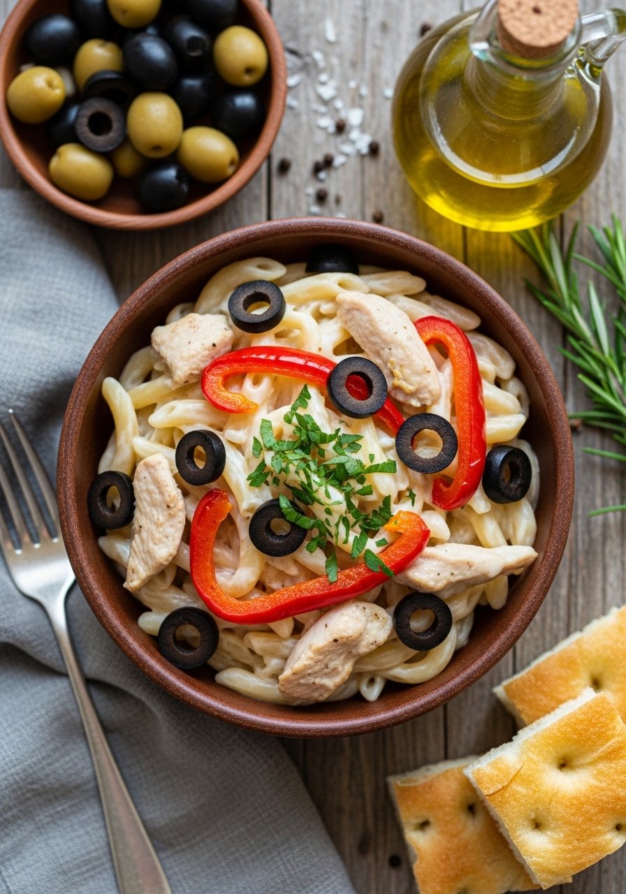 Black olives and roasted peppers introduce briny, savory notes that contrast the creamy sauce. This Mediterranean spin is bright and savory.