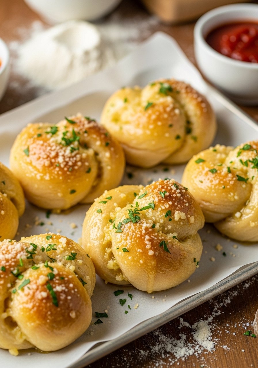 Tiny, pull-apart delights made from store-bought pizza dough—no proofing required. They’re buttery, garlicky, and soft inside with crisp edges. Kids and guests will disappear them fast.