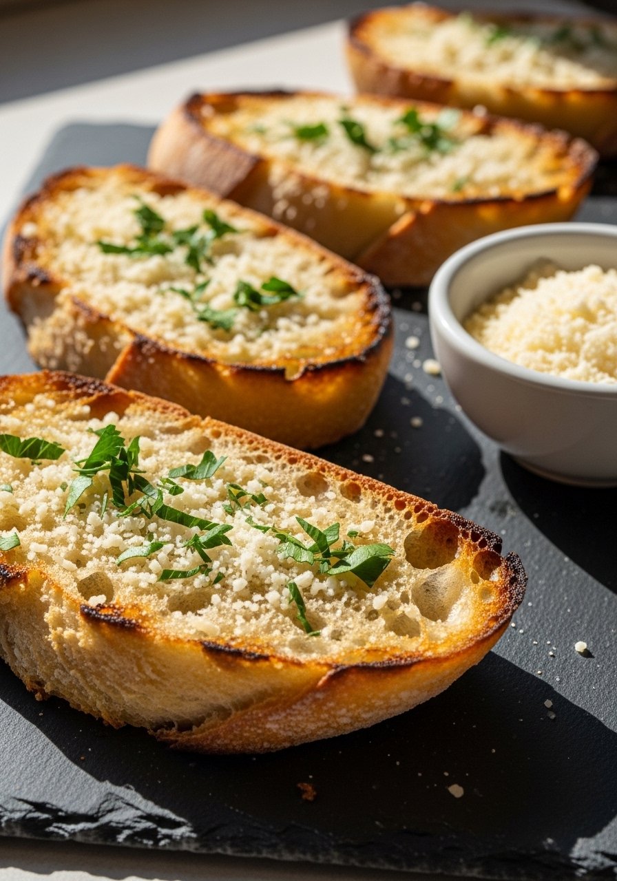 Serve on a wooden board with extra parsley garnish. Pair with a bowl of marinara or a light salad and a glass of red wine. Store leftovers in an airtight container for up to 2 days and reheat in a toaster oven for 3–4 minutes. Make ahead by mixing the garlic butter and spreading just before broiling.