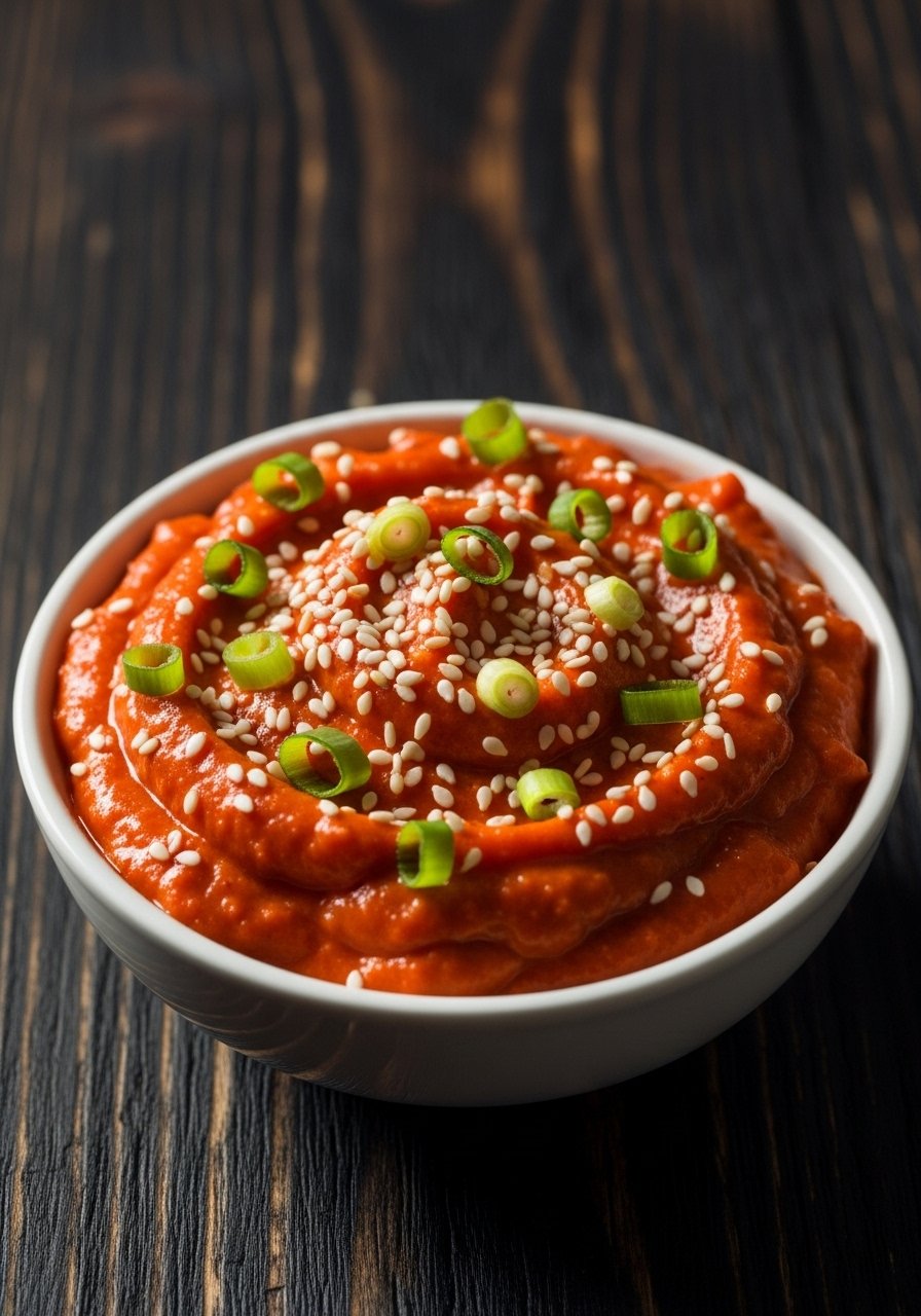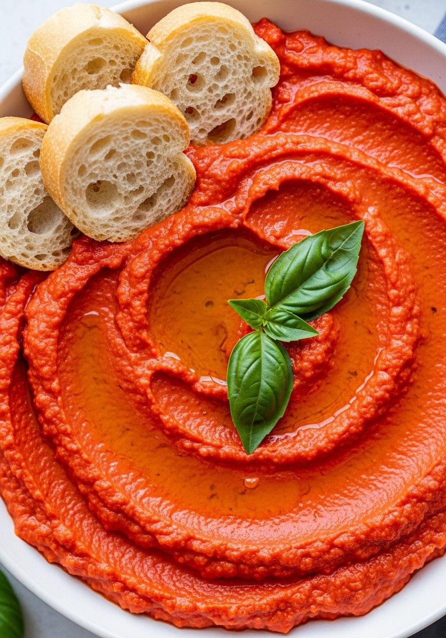 Smoky roasted red peppers add vibrant color and sweet flavor to a garlicky dip. Smooth and spreadable, it’s visually striking and full of Mediterranean charm—great for picnics and tapas.