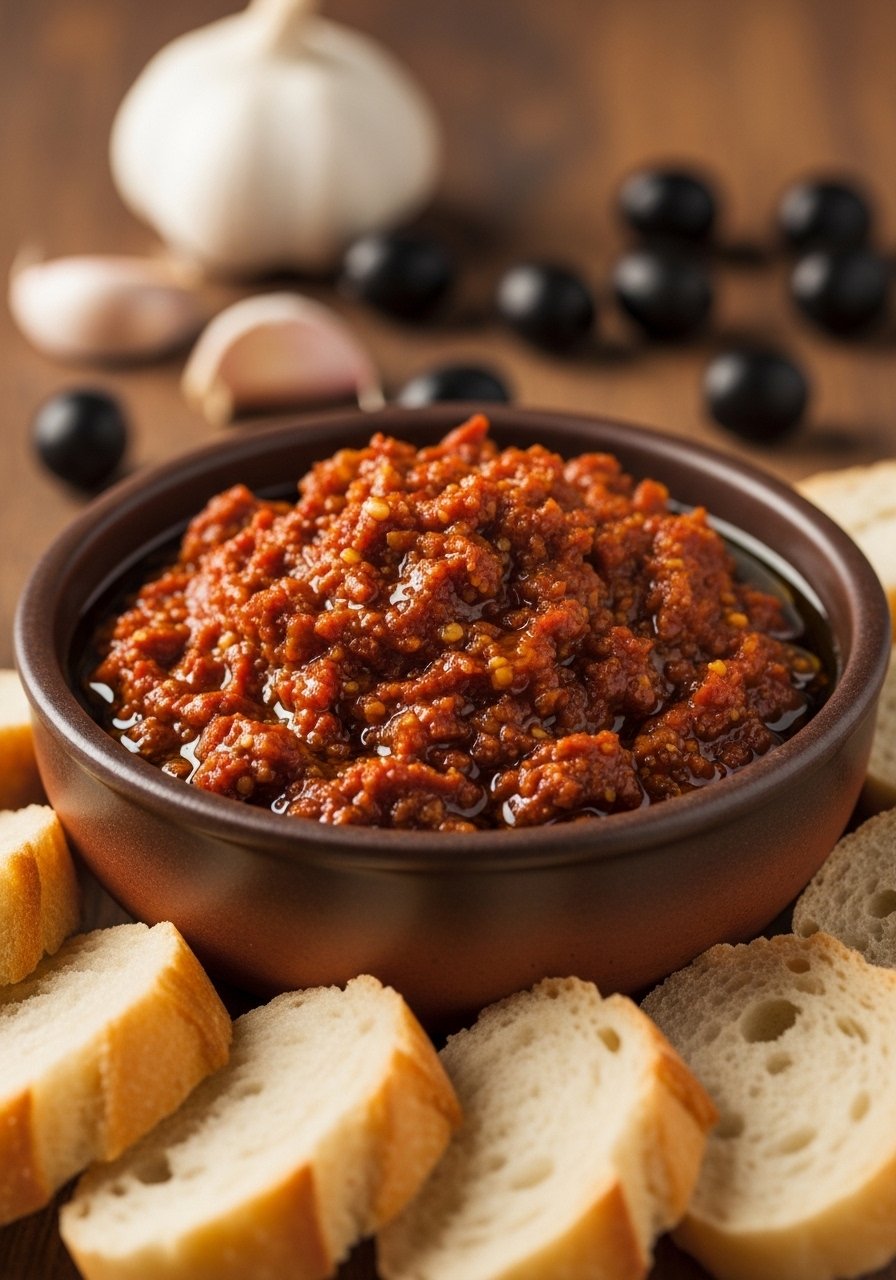 This tapenade-style spread is briny, garlicky, and perfect for guests who like bold, savory flavors. The texture is chunky and satisfying with salty undertones from Kalamata olives.