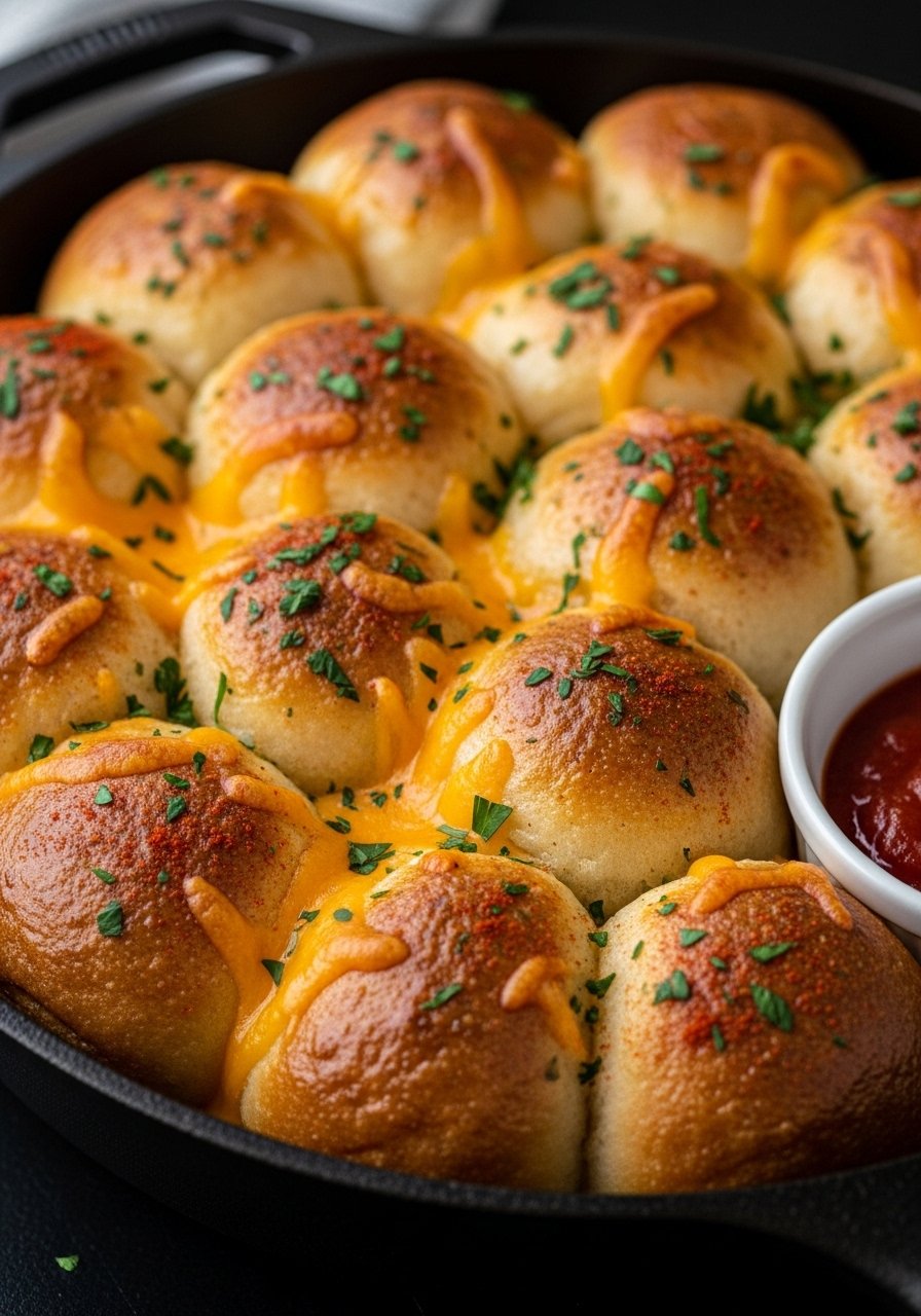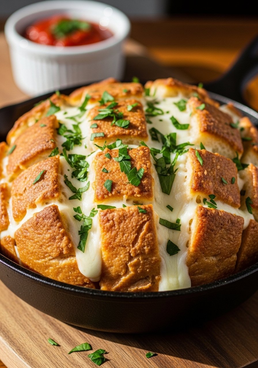 This is the crowd-pleasing classic: soft, buttery bread stuffed with garlic herb butter and bubbling mozzarella. It’s textural—crispy edges and pillowy cheese-filled pockets—perfect for sharing at game day. You’ll love the garlicky aroma that fills your kitchen. Use a bench scraper to slice the loaf cleanly.