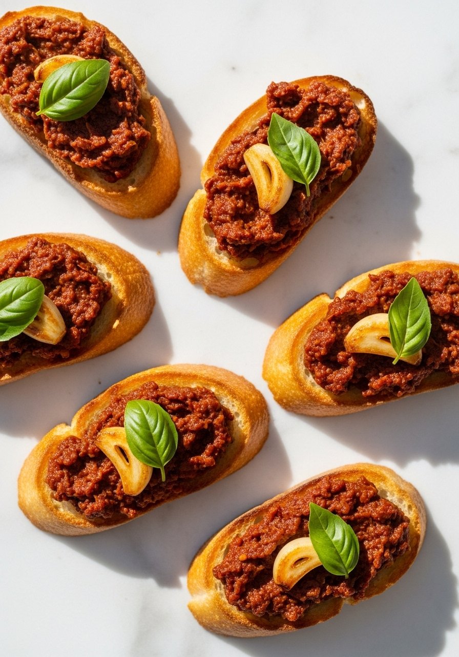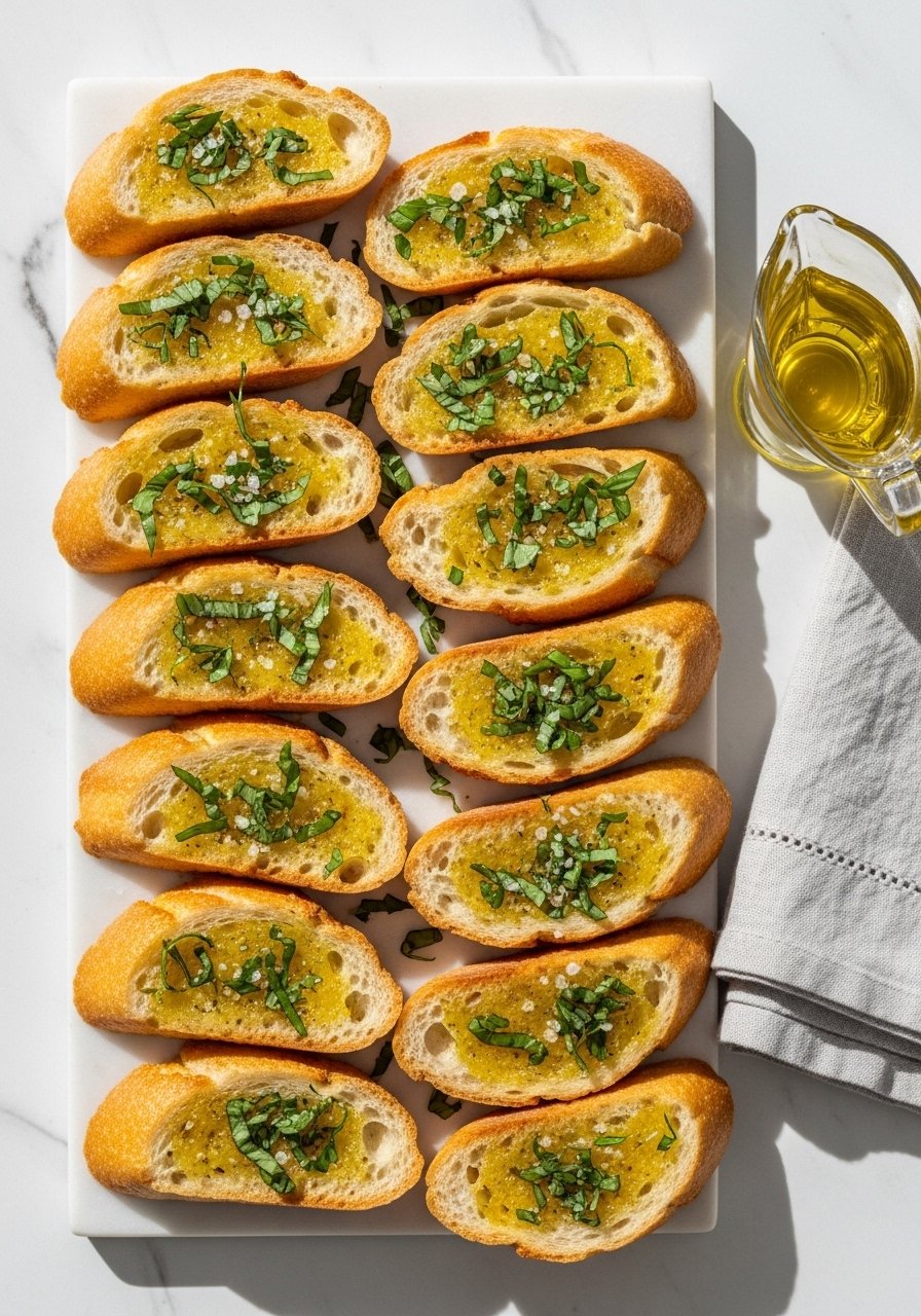Thinly sliced baguette brushed with a fragrant garlic-herb oil for a crunchy, snackable option. These are great for big platters because you can double the recipe effortlessly. I use a microplane grater to zest garlic into a fine paste for even flavor.