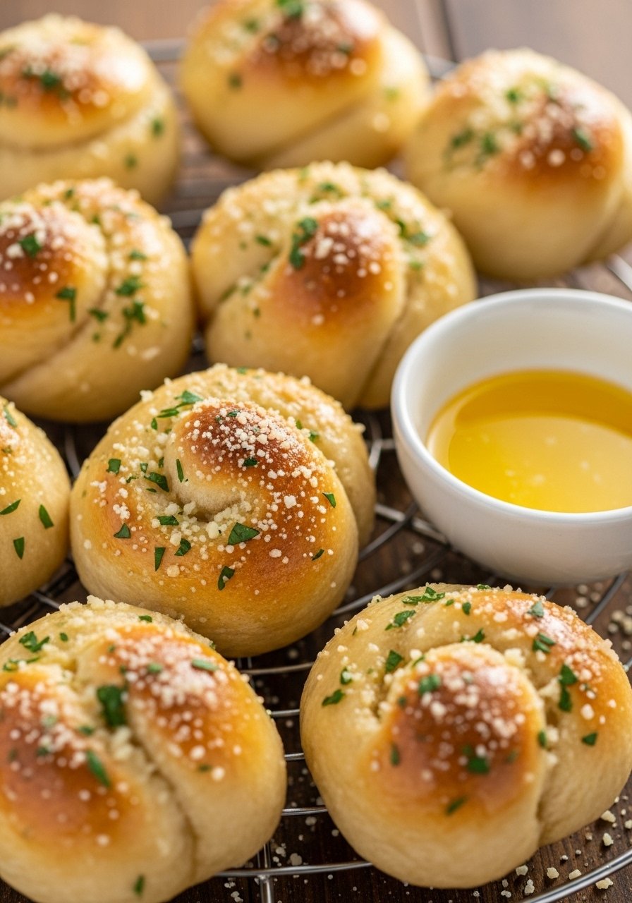 Soft, pillowy knots brushed with garlic butter and studded with Parmesan—perfect finger food for crowds. These are great straight from the oven and scale by making more dough. I shape dough on a silicone baking mat to prevent sticking.