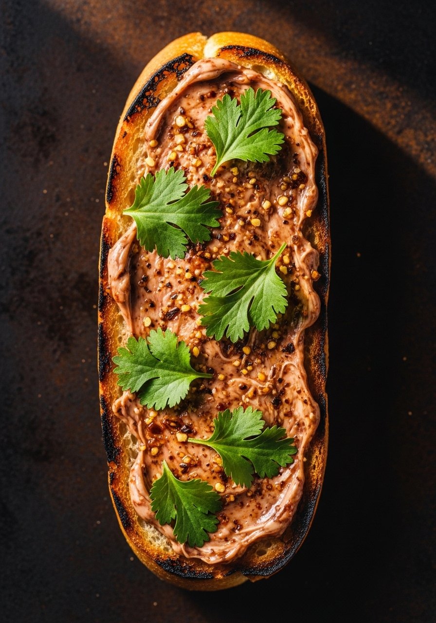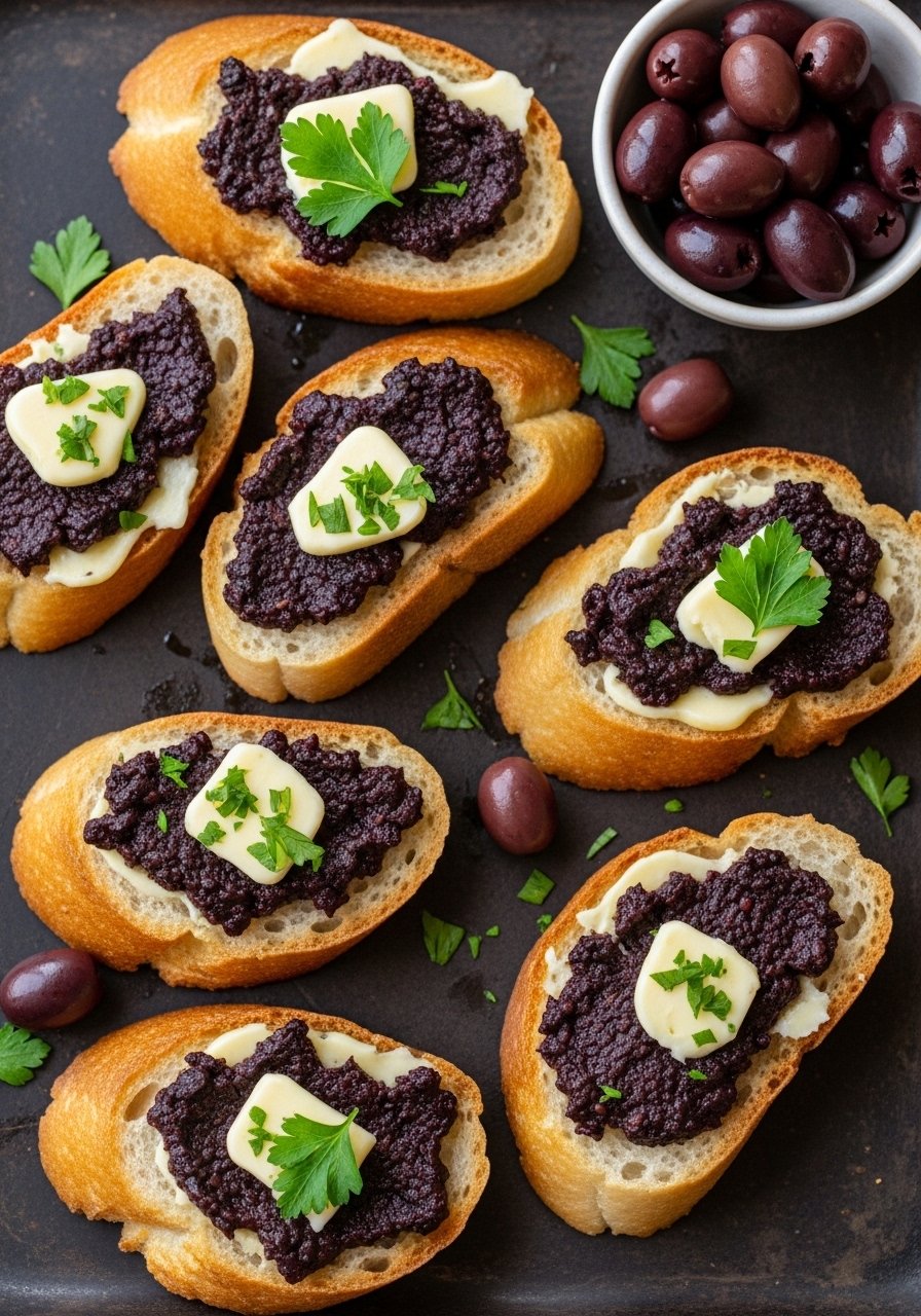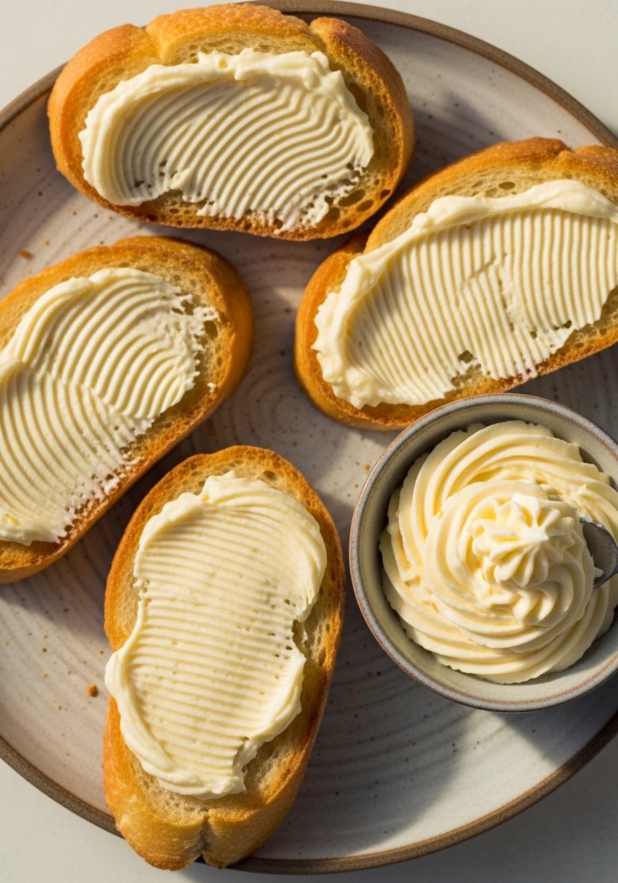 5. Spread garlic butter on bread halves and dot with whipped goat cheese.