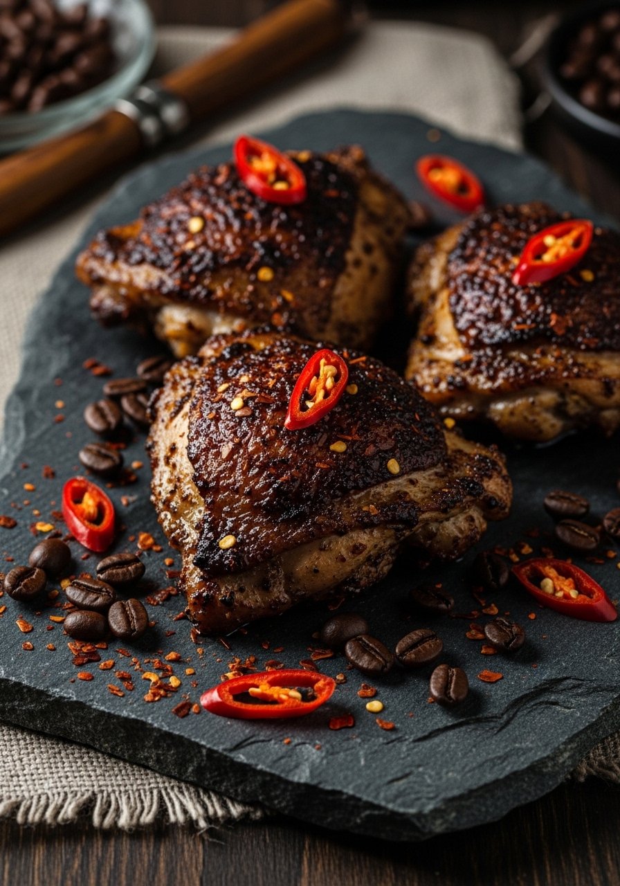 - Mix coffee, brown sugar, paprika, chili powder, garlic powder, salt, and pepper. Rub over thighs.