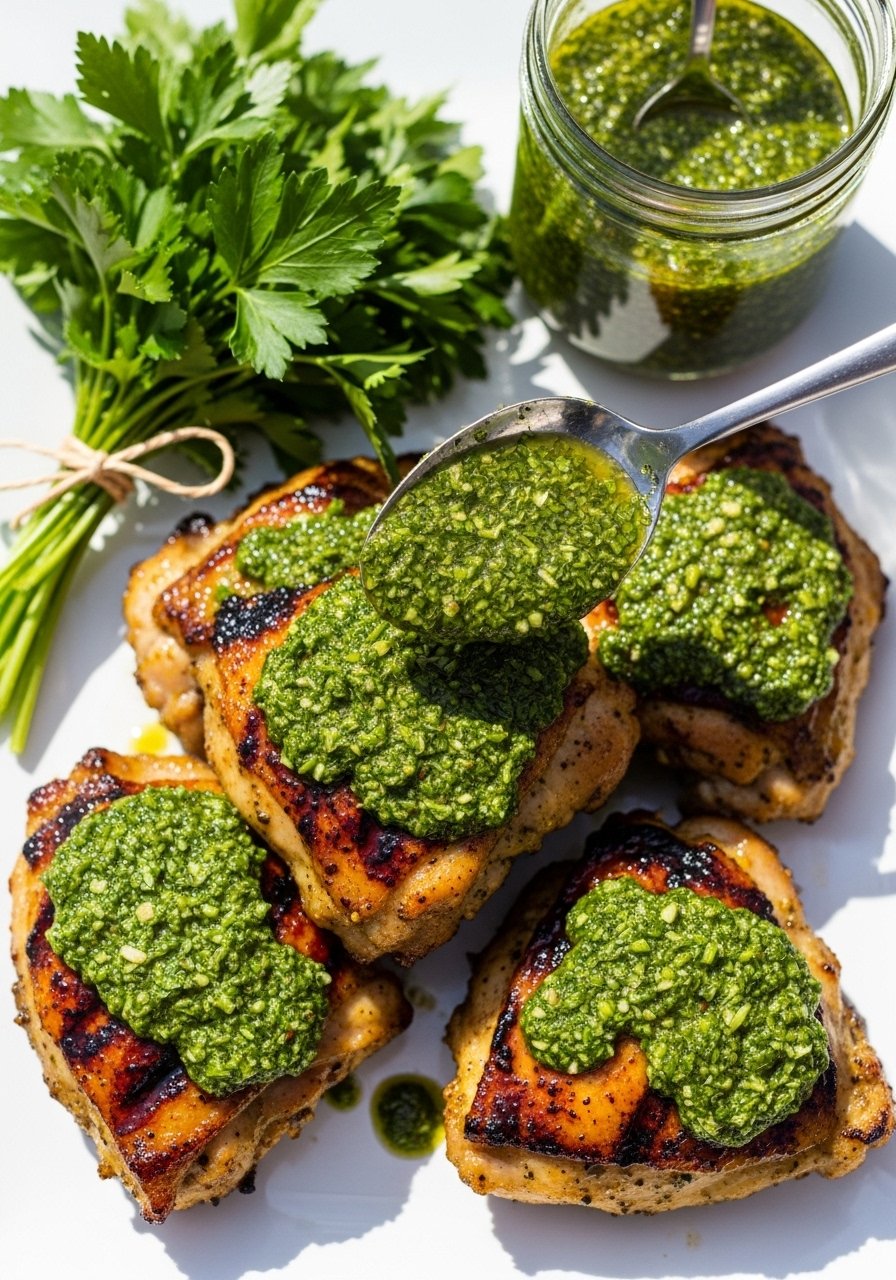 - Marinate thighs 30 minutes in half the chimichurri; reserve rest for serving.