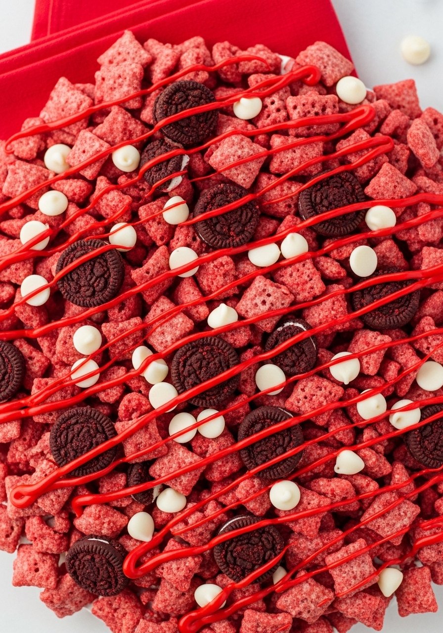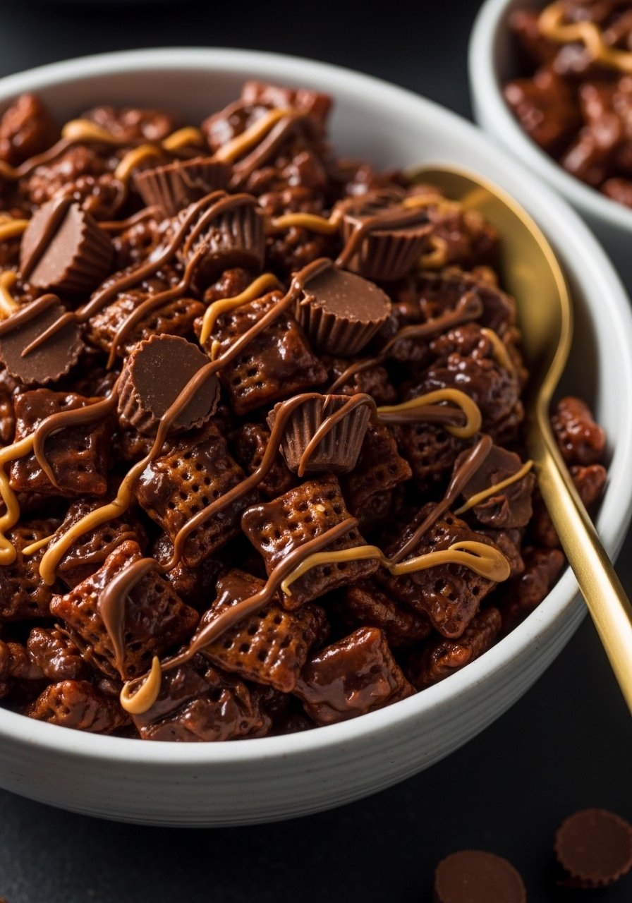 This is peanut-buttery comfort in a bite. Mini peanut butter cups, peanut butter drizzle, and crunchy Chex make a sweet-salty snack that disappears fast. The texture is thick, slightly sticky, and deeply chocolatey.