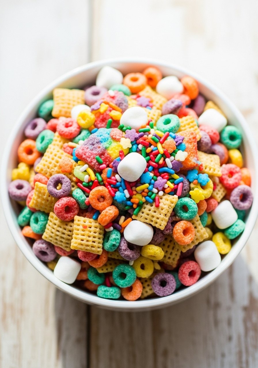 A kid-favorite, cereal-forward mix that’s neon and sweet. Fruity Pebbles add bold fruit notes while marshmallows keep it soft and nostalgic.