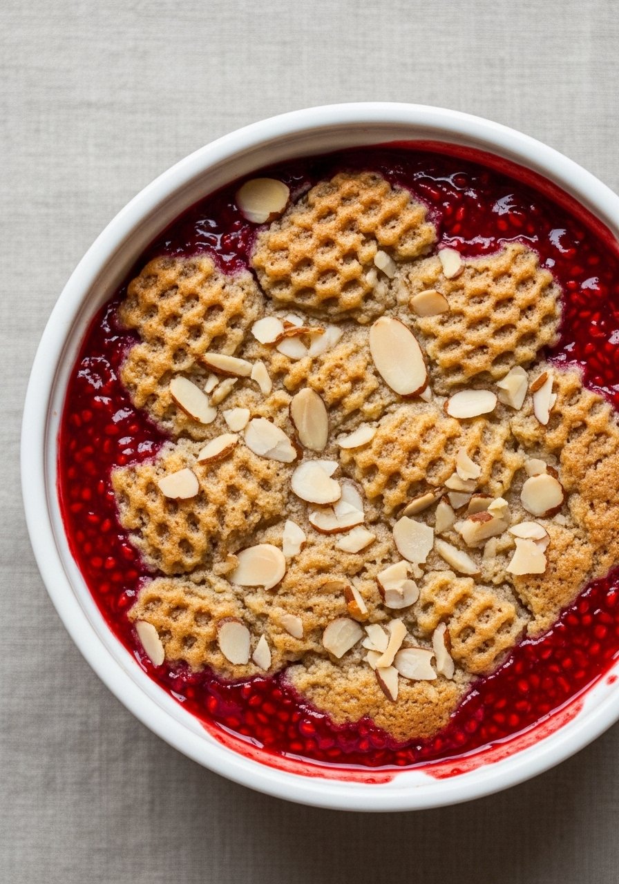 Bright, tart berries get the spotlight in this lower-sugar dump cake. The topping uses almond flour and just a touch of coconut sugar for nuttiness and crisp edges. It’s lightly sweet, tart, and perfect for summer or late-winter frozen berries. Fruit-forward lovers and lighter-dessert seekers will adore the juicy texture and toasted almond aroma.