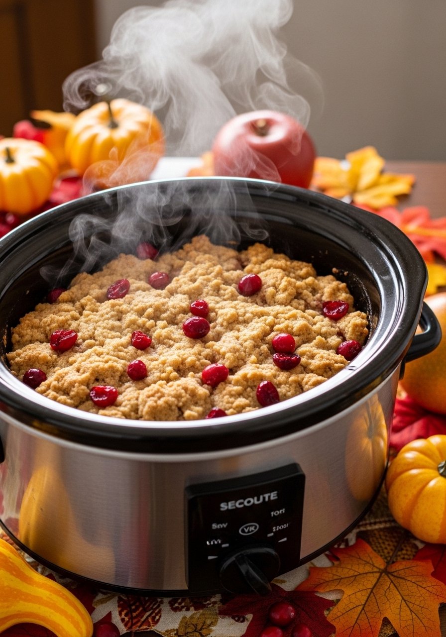 7. Cover and cook on LOW for 3–4 hours or HIGH for 1.5–2 hours until fruit is soft and topping set.