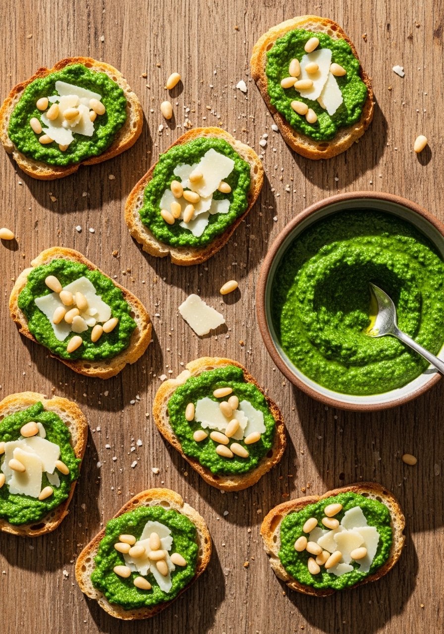 - Spoon onto toasted baguette slices; top with Parmesan or pine nuts if using.