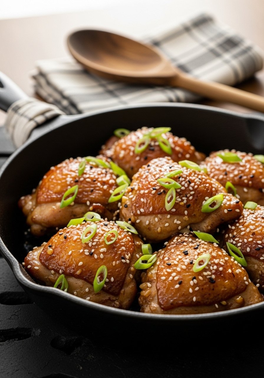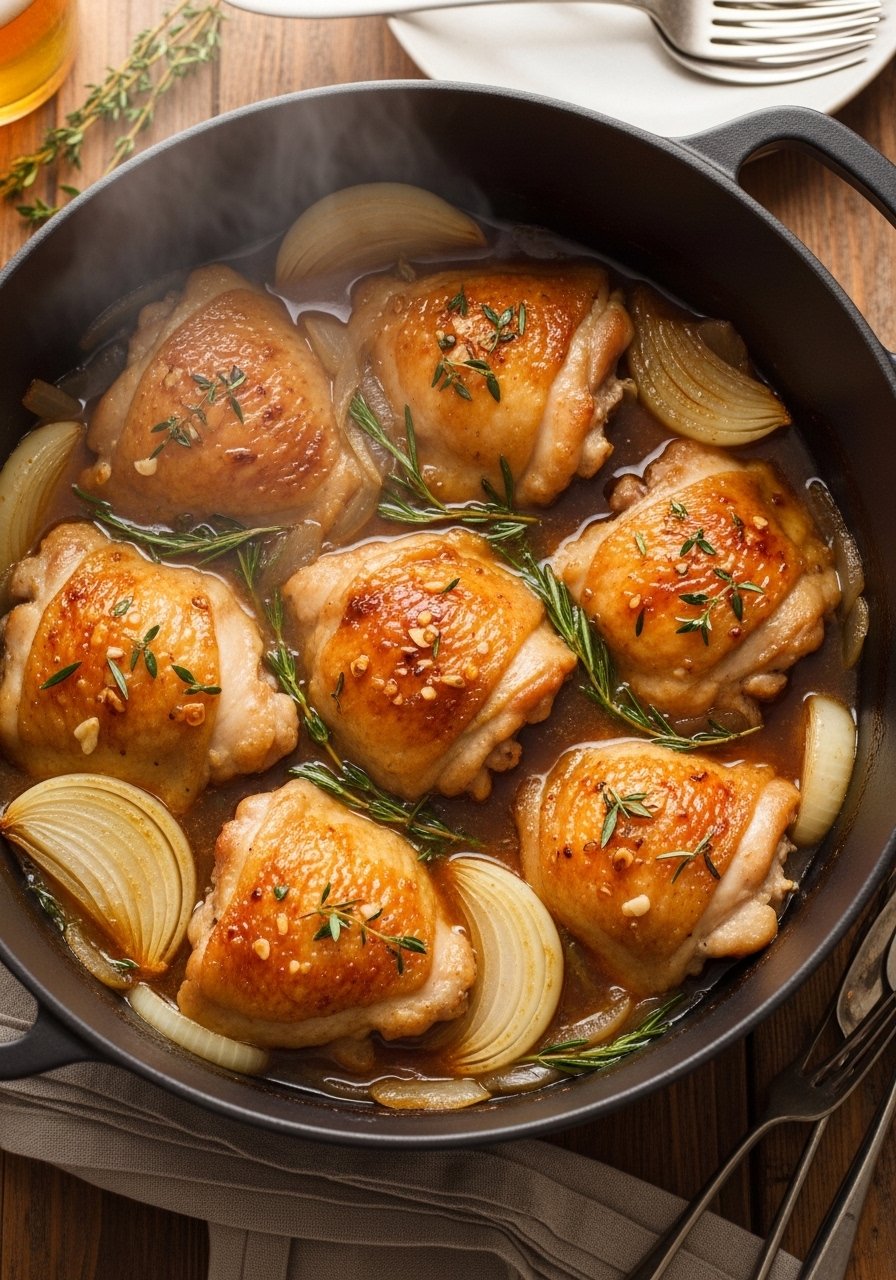 - Heat skillet over medium-high, add oil, and sear thighs skin-side down 6–7 minutes until golden.